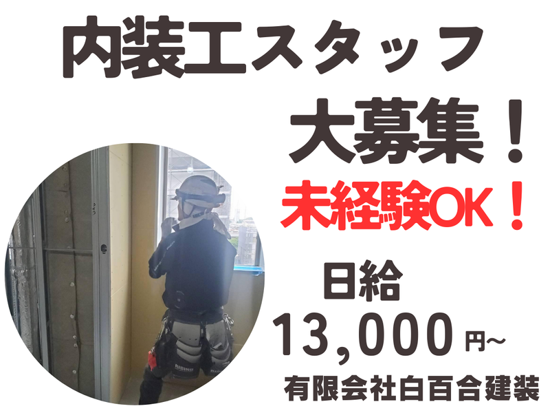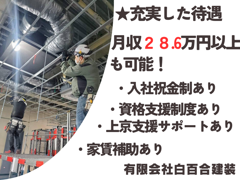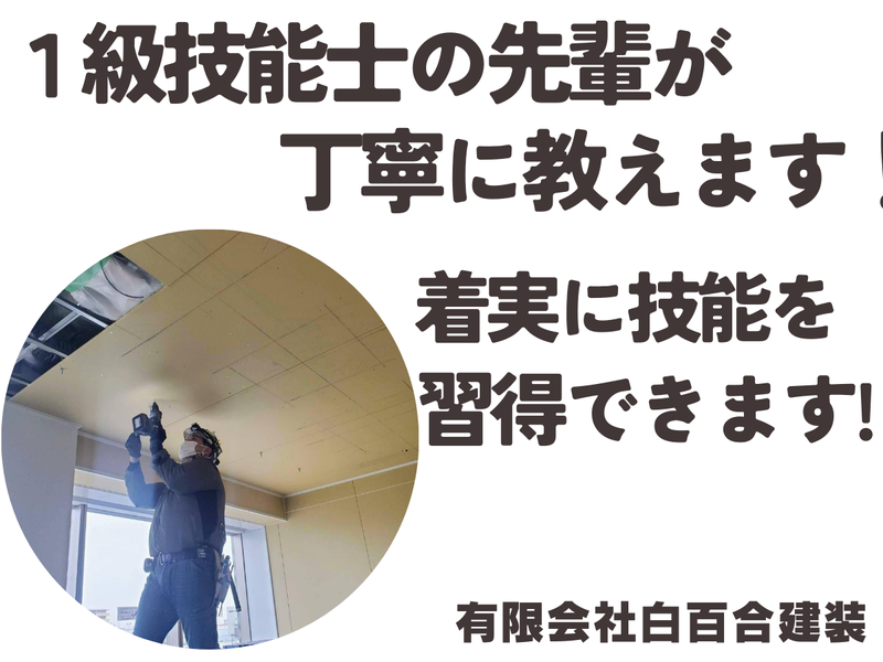 職種/仕事内容 | 仕事内容 ≪未経験の方も歓迎! 内装工仕上げ工事スタッフ 募集≫ 【このお仕事のポイント】 ✅未経験者・ブランクのある方も大歓迎 基礎から丁寧に指導します。 1級技能士の先輩が多数在籍しているため、着実に技術を習得できます。 ✅安定した基盤でキャリアアップ 業績好調の企業で、資格取得支援制度や早期独立支援制度があり、長期的なキャリア形成が可能です。 ✅充実した待遇 月収28.6万円以上も可能!入社祝い金、上京支援など手厚いサポートがあります。 ✅働きやすい環境 八潮駅から徒歩7分とアクセス良好。 直行直帰も可能です。 ✅スピーディーな選考 応募から内定まで平均1週間程度。さらに面接は1回のみ! 入社日の調整も柔軟に対応します。 【仕事内容詳細】 オフィスビル、マンション、商業施設などの内装仕上げ工事をお任せします。 具体的には、 ◆軽量鉄骨材で建物内の天井や壁の骨組みを作る「軽天下地処理」 ◆下地に石膏ボードなどを貼り付ける「ボード貼り工事」 がメインです。 【当社のすべてがわかる採用サイト】 より詳しい情報については、ぜひ当社ホームページをご覧ください。 ホームページでは、会社案内や事業内容はもちろん、社員インタビューを通じて仕事のやりがいや会社の雰囲気などもお伝えしています。 ぜひ、ご覧ください!! ↓ https://www.shirayurikensou.com/ ↑ リンクが機能しておりません。 お手数ですが、URLをコピーしてブラウザで直接開いてください。 【未経験の方大歓迎】 入社後は、道具の名前や使い方、建材の種類、図面の読み方など、基礎の基礎から丁寧に指導します。 まずは、先輩のお手伝いからスタートし、徐々にステップアップしていきます。 【サポート体制も充実】 ◆資格取得支援制度もあり、業務に必要な資格は会社負担で取得をサポートします。 ◆独立支援制度もあります。将来「自分の会社を持ちたい」という夢も応援します。 ◆新たなスタートを応援する「入社祝金」もあります(規定あり)。 <有限会社白百合建装について> 内装仕上げ工事の白百合建装は業績好調、業務増加中! 安定した基盤で、お客様の信頼に応える仲間を募集中です。一緒に技術を磨き、会社を成長させませんか? ご応募お待ちしております。 |