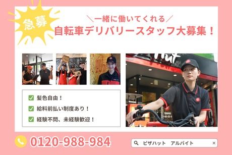 職種/仕事内容 | 仕事内容 お任せするお仕事 自転車デリバリースタッフ免許がなくても配達ができちゃう☆☆ピザハット(PIZZAHUT)の店舗で、お客様へ商品をお届けする仕事をしていただきます。 まずは地図で住所とルートを確認し、オーダーシートに従って保温バッグに商品を入れ安全運転で配達します。 新しい仲間を募集中! おかげさまで業績好調のためNEWスタッフを大募集!バイトが初めての方、久しぶりのお仕事復帰の方、Wワーク希望の方などみ~んな大歓迎です! 最高の仲間たち 年齢に関係なく、活発にコミュニケーションを取っているので、スタッフ同士の仲の良さもバッチリ!あなたもスグに打ち解けることができるハズです! キャリアアップも目指せます ピザハットは育成にも力をいれています!「ピザハットアカデミー」という教育制度があるため、未経験からでも安心してご活躍いただけます。ゆくゆくはアルバイトから正社員を目指すことも可能!ピザハットの成長と共にキャリアアップを目指してみませんか? |