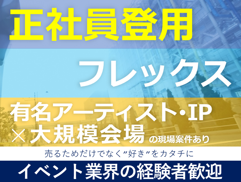 職種/仕事内容 | 仕事内容 イベント現場での グッズ販売をメインで お任せいたします☆彡 ◎求人のポイント =================== ✅正社員登用率90%以上! 半年後のキャリアが描ける ✅20代・30代スタッフが活躍中! ✅グッズを売るだけではなく、 魅せる・届けるをプロデュース ✅現場経験が豊富なスタッフがサポート! ✅アニメやゲーム、音楽など、 エンタメ分野のプロモーションで 豊富な実績を保有 ✅フレックスタイム制度導入! ◎募集の背景 =================== 設立以来、エンターテインメント分野を はじめとした、様々なクライアントの プロモーションを支援してきた当社。 今回は当日のイベント会場での グッズ販売の企画を担当する メンバーを新たに募集します。 ◎仕事内容 =================== コンサート・イベント会場での アーティストグッズ販売に向けた 計画の立案や当日の運営などを お任せします。 【具体的には】 コンサートやイベントの会場で、 アーティストグッズの販売に向けた グッズ陳列、販促POP、接客トークなどの 販売企画、運営をお任せします。 ※大きな箱の運搬作業などもあります。 入社後はまず、先輩スタッフに同行して 各案件の流れを知るところからスタート。 ◆イベント会場でのグッズの陳列方法や 販促POPの企画 ◆集客規模、会場規模などのデータを もとにした総予算、スケジュールの立案 ◆アーティストや所属事務所、 イベント主催者の意向を反映した アイテムの選定 ◆商品販売施策・戦略の構築 ◆商品管理・在庫管理 ◆予算管理・損益管理 など ※グッズは自社で企画制作しており、 実際に販売する商品を深く知ったうえで それを届けていく仕事に携われます。 ※ひとり立ちして以降は、一つの ツアー・イベント全体のグッズ販売に 関わる業務を担当。 オフィスと各地の現場を行き来しながら 案件を進めていきます。 ◎アーティストグッズの販売に トータルで関わっていく =================== アーティストのツアー、イベント会場で たくさんのファンが 楽しみにしているグッズ。 その販売に関わる業務をトータルで 担当するのが、今回募集している ポジションです。 販売だけではなく、 VMD・ディスプレイ POP設計・接客トークの設計まで 関わることができ、 商品開発会議に現場の声を 届ける事も可能。 現場経験を活かしたグッズ販売の ディレクションは グッズを心から楽しみにしている ファンの推し活の一部になる きっと大きなやりがいになるでしょう。 アーティストとファンの “懸け橋”となる仕事に、 あなたも一緒に チャレンジしてみませんか? ◆総合的な事業を展開  ̄ ̄ ̄ ̄ ̄ ̄ ̄ ̄ ̄ ̄ ̄ ̄ ̄ ̄ ̄ ̄ ̄ ̄ 当社は幅広い分野のプロモーションを 支援する広告会社です。 その中で、グッズ関連の部門では 企画制作~販売まで総合的な事業を展開。 売る+演出する仕事だからこそ 制作現場も身近にあるため、 商品づくりの背景とァン心理を理解した ファンへグッズを届けることができます。 ◆現場経験を活かしてアイデアを形に  ̄ ̄ ̄ ̄ ̄ ̄ ̄ ̄ ̄ ̄ ̄ ̄ ̄ ̄ ̄ ̄ ̄ ̄ 今回の採用にあたっては、 販売、接客業務経験があり 商品づくりや売り場づくり、VMDなどに 挑戦したい方に向けた採用です。 職種経験は問いませんので、 「興味がある」という方は ぜひご応募ください。 仕事に必要なことは、 入社後にOJTをメインに 基礎から丁寧に指導。 着実にステップアップできるよう サポートしていきます。 【現在活躍しているスタッフ】 *アパレル販売の経験がある方 *元雑貨店スタッフ経験者 *VMD経験がある方 *エンターテイメント系の学校出身の方 *接客業、アパレルなどの職歴がある方 *ホテルの運営補助に携わっていた方 …その他、現場経験を活かした転職者が多数! ◎採用担当より =================== ◆アーティストの世界観に貢献  ̄ ̄ ̄ ̄ ̄ ̄ ̄ ̄ ̄ ̄ ̄ ̄ ̄ ̄ ̄ ̄ ̄ ̄ グッズ販売運営はただグッズを売るだけ ではなく、アーティストの世界観を 壊さない接客やファンの推し活の一部を プロデュースしていきます。 グッズの売れ行き、お客様の声、ニーズなど 様々な情報をチームで共有することで 最新のトレンドをキャッチアップ。 現場経験×フィードバックで アーティストとファンを繋ぐ 一期一会の出会いをプロデュースします。 ◆たくさんの人が喜ぶ姿がやりがいに  ̄ ̄ ̄ ̄ ̄ ̄ ̄ ̄ ̄ ̄ ̄ ̄ ̄ ̄ ̄ ̄ ̄ ̄ 接客から一歩引いたポジションですが グッズ販売のプロデュースに関わるため アーティストのグッズを 心待ちにしているファンの方の 喜んでいる姿は大きなやりがいに なるでしょう。 ポップアップや物販ブースの設計、 ディスプレイ提案にもかかわるため VMD経験者も活躍できます。 <将来あなたに期待したいこと> ◆長期的な目線でステップアップを  ̄ ̄ ̄ ̄ ̄ ̄ ̄ ̄ ̄ ̄ ̄ ̄ ̄ ̄ ̄ ̄ ̄ ̄ 入社半年で9割が正社員になるため 安定した雇用を目指しながら エンタメ業界の刺激を両立できます。 また、フレックスタイム制度を導入しており 長く、安定的