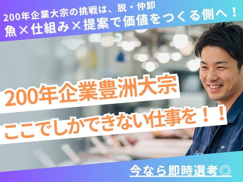 職種/仕事内容 | 仕事内容 ◉徳川より長く続く、仲卸企業「大宗」◉ 江戸時代を築いた徳川家は15代で約265年間続きました。 日本で最も長く続いた時代の一つです・・・。 私たち大宗(だいそう)は、200年以上・18代続いている水産仲卸です。 日本橋 → 築地 → 豊洲と場所を変えながら、 日本の和食を裏側から支え続けてきました。 「市場が止まったら、街の飲食店もスーパーも回らない」 そう本気で信じている人にこそ、 この“200年企業の次の一手”を一緒につくってほしいと思っています。 ◉大宗は他の仲卸と何が違うのか◉ 大宗が掲げているのは、「脱・仲卸」。 ただ魚を仕入れて流すのではなく、 ・お客様のメニューや売り場を一緒に考える ・産地のストーリーも含めて提案する ・「あの店には、今日はこの一本でいこう」と組み立てる そんな、“お客様の商売パートナー”として動くことを大事にしています。 だからこそ、 「発注書をたださばく人」ではなく、 「この店のこと、よく分かってるね」と言われる仲卸になりたい人に来てほしいのです。 ◉アナログじゃない!市場の仕事をつくる◉ 大宗は、市場の“熱”や“空気感”はそのままにしつつ、 デジタル化・仕組み化にも本気で取り組んでいる仲卸です。 発注書はデジタル化し、どこから何の注文が来ているかを見える化 どの魚がどのお客様に向かうのか、配送・在庫もシステムで管理 現場の感じ方をベースに、「やりやすいツール」を一緒につくっていく 「紙とFAXと記憶だけで回す」のではなく、 “目利き+仕組み”で、お客様を守る仲卸に変わろうとしています。 あなたには、 これまでの経験を活かしながら、 ・飲食店・小売店の発注対応 ・売場での接客・提案 ・仕入れのサポート に加えて、 「こうしたほうが新人も楽」「この情報は残した方がいい」 といった現場目線のアイデアを、遠慮なく出してほしいと思っています。 ◉大宗にはどんなメンバーがいるのか◉ 大宗は、昔ながらの“家族みたいな雰囲気”と、 “新しいことを面白がる空気”が同居している会社です。 Nさん: アルバイトからキャリアをスタートし、 いまや現場をまとめる立場に。 「大宗の社風と人が好き」でここまで。 Hさん: もともとは建築の世界から飛び込んできて、 今では“雲丹職人”として全国の産地とつながっている人。 他にも、 「元々は別の業界」「市場に憧れて飛び込んできた」メンバーが揃っていて、 バックグラウンドはバラバラ。 でも共通しているのは、 “市場の仕事の価値を、今よりもっと高くしたい” という感覚です。 経験者の意見をちゃんと聞き、 「じゃあ一回やってみようか」と言える空気があります。 ◉さいごに ― 「仲卸として価値を上げる側」に回りませんか◉ これまでのキャリアを、 「言われたことをこなすだけ」で終わらせるのか。 それとも、 “仲卸として価値を高める側”に回るのか。 大宗だからできることがあります。 市場が好きで、この仕事の価値も信じている。 だからこそ、アナログなまま消耗するのではなく、 “ちゃんと胸を張れる市場の仕事”を次の世代に渡したい—— 興味があればぜひ一度お話しさせてください! |