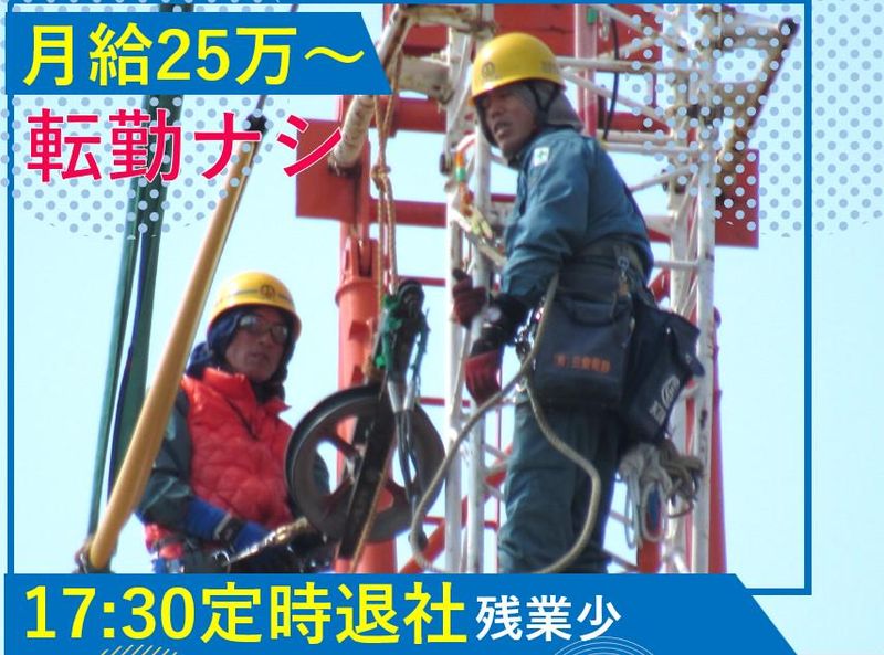 職種/仕事内容 | 仕事内容 🌸最短翌日面接OK🌸 \資格を活かして働こう!/ 玉掛け等の有資格者も大歓迎! 無資格もOK◎ しっかり稼いで、 プライベートも充実✨ ⭐高いところが得意な方 ⭐旅行好きの方、大歓迎! 『資格を活かしたい』 『安定して働きたい』 そんな方にピッタリ! ✨当社の魅力✨ ✅月給25万円以上 ✅賞与・手当充実◎ ✅年収750万円も可 ✅定時17時&残業ほぼナシ ✅実質年休120日以上♪ ✅完全週休2日! ✅中部電力関連の仕事 ✅景気に左右されない安定性 20代・30代・40代が活躍中! 未経験・無資格もOK♪ 資格取得支援ありで安心◎ あなたの資格・経験を活かし、 インフラを支える誇れる仕事へ! 【仕事内容】 送電線の点検・保守、 鉄塔の建て替えなど。 地上15~55mの高さで、 「宙乗り機」を使って作業! \空中ブランコみたい!/ 玉掛け・クレーン資格や 高所経験が活かせます! 全国でも約5,000人ほどの 限られた技術を習得可能! ✨POINT✨ 【出張・旅好きに最高♪】 主に東海3県の現場。 1現場は2〜3日~3か月程度! 出張時は1泊2食付き旅館に宿泊! 一人一部屋で快適に過ごせます♪ 宿泊費・移動費は全額会社負担◎ 長期出張でも週末は帰省OK! 【こんな方に】 ◎資格を活かしたい ◎出張や旅が好き ◎技術を磨きたい ◎安定して長く働きたい ◎稼ぎながら成長したい |