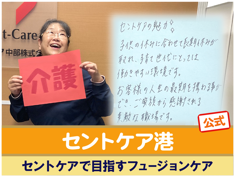 待遇・福利厚生 | 【保険制度】 労災保険 【福利厚生】 待遇・福利厚生 ※適用されない社会保険がある理由:※適用されない社会保険がある理由:社会保険加入条件に準ずる 【福利厚生】 地域で暮らすお客様(高齢者・障がい者)が、毎日の生活をご自宅でふだん通りに過ごしたい、 そうしたご本人やご家族様の力強くサポートするのが「セントケアの訪問介護」です。 ヘルパーがご自宅に訪問し、「今まで通りできる事」「少し工夫したらできそうな事」など お客様と一緒に確認しながら日常生活をサポートします。 *社会保険完備 *資格取得支援制度 *交通費規定支給 *昇給あり *入社時の健康診断は会社負担 *制服貸与 *産休・育休実績あり *社員割引 *団体長期障害所得補償(加入条件あり) *入社1年経過後、無期雇用転換 (定年68歳、68歳以上は1年毎の契約更新) *介護休暇あり *フルタイム歓迎 *長期歓迎 *県外への転勤なし *面接1回 *ブランクOK *フリーター歓迎 *学歴不問 *業界未経験歓迎 *第二新卒歓迎 *U・Iターン歓迎 *有給休暇制度 =================== 以下は、セントケア中部株式会社 (セントケアグループ)の会社紹介です。 =================== ■セントケア・グループは1983年3月に設立し、 42年目を迎えます。 現在、グループ会社30社、拠点数は全国に912箇所、 スタッフ数は1万1739人を超えています。 (2025年9月末時点) 「地域と人を結ぶヘルスケア企業」を 築くことを目標とし、 地域のお客様が安心できるサービスの充実と 住みよい環境の実現を目指します。 セントケア・グループでは、 下記のような様々なサービスを行っております。 ・デイサービス ・小規模多機能型居宅介護 ・看護小規模多機能型居宅介護 ・訪問介護 ・訪問入浴 ・訪問看護 ・居宅介護支援 ・福祉用具レンタル・販売 ・ショートステイ ・グループホーム ・定期巡回 ・有料老人ホーム ・住宅リフォーム ・サービス付高齢者住宅 ・在宅ホスピス 幅広いサービスを行っているからこそ、 1人1人のライフスタイルに合わせた働き方や仕事内容を 提供することができます。 セントケア中部では、毎年新しい事業所や 事業をスタートしております。 オープニングスタッフとして働きたい方や 新しいことにチャレンジしたい方にもオススメです。 ■2024年は7月にセントケア訪問看護ステーション港をオープン! <数字で見るセントケア> ■男女比■ 男性89名:女性371名 ■雇用形態■ 正社員(146名) アルバイト・パート(314名) ■年代別■ 10代(3名) 20代(46名) 30代(79名) 40代(124名) 50代以上(208名) ■勤続年数■ 5年(269名) 5年~10年(123名) 10年~15年(48名) 15年~(20名) ============ お客様の役に立てる幸せ。 笑顔をつくれる喜び。 ============ セントケア中部株式会社では、 スタッフ1人1人が自信と誇りを持って働ける環境で、 自らがお客様の生き甲斐を想像できるように取り組んでいます。 |