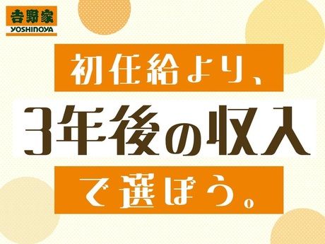職種/仕事内容 | 仕事内容 年収100万をアップさせるには「大卒で」5年は必要と言われてますが、吉野家では同じ5年で、しかも「高卒で」年収300万以上アップ。月に30万以上アップしてることになります! 初任給だけで判断してると損しちゃいますよ?(笑) 【高卒・正社員未経験・フリーターの店長も沢山!】 秀でた才能がないと店長になれない、なんてことはありません。研修で学んだことや先輩、上司のアドバイスを着実に実行していれば、未経験者でも最短1年で店長になれます!学歴や経験がなくても、どんな人でも店長になれるのが吉野家なんです。 入社時はどんなキャリアを描きたいか、想像できない人がほとんど。 店舗で「オペレーションがうまくいった!」「スタッフの育成にやりがいを感じた!」など色んな経験を経て、なりたい自分を見つけていってください。 【社長だって高卒!】 社長が吉野家に入社した時は、寝坊もとんでもない失敗もたくさんしたとか…。ただテキトーに働いていたんじゃなくて、一生懸命仕事に向き合ってました。 だから店長にも社長にもなれたんです。 こんな経験をしている社長のもとだから、吉野家は頑張る人を見捨てない。学歴や経験なんて関係ありません。「がんばろう!」という気持ちがあることがわかれば、どんなに失敗したって構いません。目の前の失敗だけを見て評価することはなく、ちゃんと向き合って評価します! \ 入社後はここから! /  ̄ ̄V ̄ ̄ ̄ ̄ ̄ ̄ ̄ ̄ ̄ ̄ 接客や調理、食材の発注など、吉野家の店舗運営に関わる店舗スタッフからスタート!その後、アシスタントマネジャーや店長へとステップアップしていきます。 \\ 意外と知られていない吉野家 //  ̄ ̄ ̄ ̄ ̄ ̄ ̄ ̄ ̄ ̄ ̄ ̄ ̄ ̄ ̄ ̄ ̄ ̄ ̄ ポイント(1) 24時間営業の店舗は全体の26%! └24時間営業の印象が強い人も多いかと思いますが、実は全体の4分の1しか、店舗はありません。 ポイント(2) 週休二日制で残業は少なめ └業界でも珍しい、週休二日制を採用。月8~10日のお休みがあります。「完全自動食洗ロボット」や「AIシフト作成システム」など積極的に機械化を推進することで、業務負担を減らしているため、残業も減っています。 ポイント(3) 店長以外のキャリアも多数! └実は、社長や部長、広報や人事、商品開発まで全キャリア現場出身!様々なキャリアを広げられるのも魅力のひとつ! ポイント(4) 転居を伴う転勤なし └全国転勤はなく、配属は基本的に自宅から1時間以内の店舗です! 【経営理念】 人のためを考え、人を大切にし、人に必要とされたいという思いが込められた「For the People」。 やりがいのある、充実した人生を吉野家と共に歩んでもらいたいという想いが込められています。それを実現するため、皆さんが「吉野家と言えば」で連想してくださる言葉、「うまい、やすい、はやい」とかけて、採用する皆さんにも、”育成が「うまい」、挑戦し「やすい」、成長が「はやい」”と思っていただけるよう、活躍できる環境や頑張りを正当に評価できる制度を整えています。 【入社後の流れ/研修制度充実】 ▼3ヶ月間の入社後研修 初日からいきなり店舗に立つことはありません! 基礎研修で業務や店舗運営に関わる知識を学びましょう。 ※研修期間は仙台のモデル店舗で実習を行います。(交通費・宿泊費は全額会社負担) ▼実際の店舗で実践 研修後はアシスタントマネジャーとして、研修で学んだことを実際の店舗で実践! 半年~1年間は現場で経験を積んでいきましょう。 ▼店長昇格試験を受験 合格後、初級店長として1店舗をお任せ! 先輩店長やエリアマネジャーなどに相談できる環境も整っています◎ 20代で店長をしている社員も沢山います。 初級店長後は、中級店長・上級店長・エリアマネジャーというステップで昇格していきます。 ステップアップに必要なことは研修で学べるので、着実に成長できますよ! ■ 店舗マネジメント以外のキャリアも! 他の業務やポジションへチャレンジできる、社内公募制度もあります◎ 商品企画・店舗開発・管理部門・エリアマネジャー・海外・グループ会社の社長などなど… 当社で、あなたの興味や強みを磨き、たくさんの可能性を広げていきませんか? |