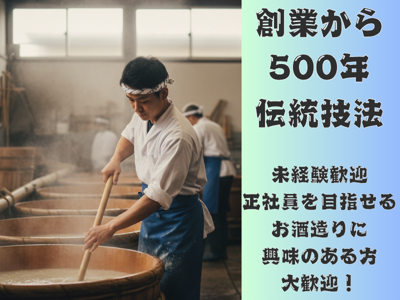 対象となる方 | 求めている人材 【歓迎条件】 ・お酒造り興味や関心がある ・学生時代にお酒造りについての研究や携わった経験がある ・正社員を目指したい 【あれば尚可】 ・フォークリフト運転技能 |