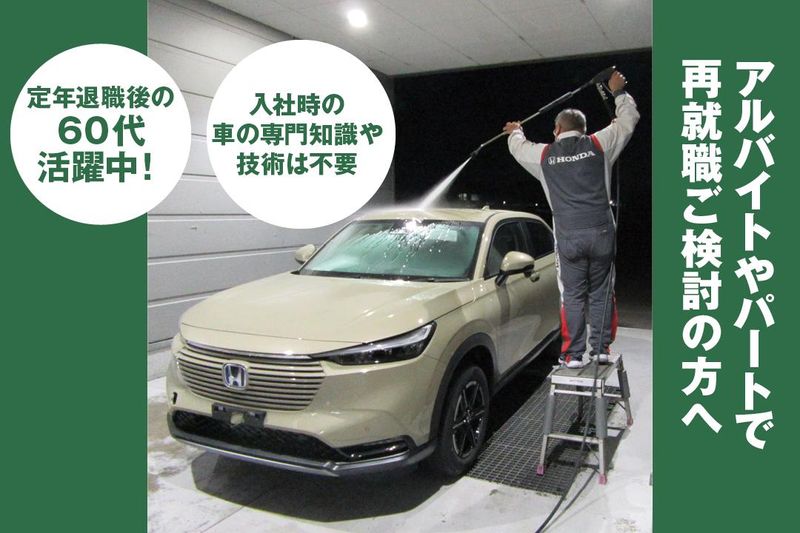 職種/仕事内容 | 仕事内容 HONDA新車センター内での洗車や 車の内装清掃などの軽作業がメインのお仕事。 屋根付き作業場内での軽作業です。 ////ここがポイント♪//////// ・車の知識が無くても気軽に働ける! ベテランスタッフが丁寧にサポートしますのでご安心くださいね。 ・ブランクがあっても大丈夫! 少しずつ覚えていってくださいね。 ・健康維持にもぴったり! 適度に体を動かしながらできる仕事です。 ※洗車時に脚立に乗ったり濡れたところでの作業があります。 //////////////////////// <具体的な仕事内容> ・洗車 ・内装清掃 ・車両移動(センター内のみ。公道は走りません。) ・ウォッシャー液補充 ・空気圧点検 車関連の業務経験や専門知識は不要! 最初は先輩スタッフが手順や作業方法など、丁寧にお教えしますので、やりながらスグ覚えられますよ♪ また、清掃や洗車作業は屋根付きの作業場で作業でき、空調設備もあります。 ☆事務所内での簡単な事務作業 書類整理や簡単なPC入力作業などがあります。 ほぼ単純作業で難しいスキルは不要です。 \退職後の方も歓迎!/ 現在パートアルバイトで活躍している方は60歳以上の方です。 体力が心配という方もいるかもしれませんが、洗車や室内清掃などがメインなので、立ち仕事ですが重労働ではなく程よい運動といった感じです。 実際に60歳以上が活躍していて、車関係のお仕事未経験の方もいるので、どんな方でも始めやすい仕事です♪ \こんな方々が働いています♪/ 現在福井営業所では正社員6名、AP2名が在籍。 20~60代まで幅広い世代が活躍しています! 若い男性ばかりが活躍していると思われがちですが、定年後の方や女性も活躍している職場ですよ! <新車センターって何することろ?> 新車は車の製造工場から新車センターを介して販売店へ納車されます。 新車センターでは販売店へ納車される前に、カーナビやドライブレコーダーなどの電装品を取付たり、洗車・室内清掃などを行う場所です。 エンドユーザーに届く一歩手前の最終工程に関わることができる大切なお仕事です。 |