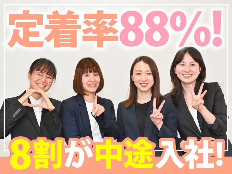 職場環境・雰囲気 | 職場環境 ≪ほとんどの先輩が中途入社で安心≫ 8割の正社員の方が中途入社で、 女性営業も多く活躍しています。 定着率は88%と非常に高く、 この仕事を気に入って長く続ける方が 多いのも当社の特徴です。 |