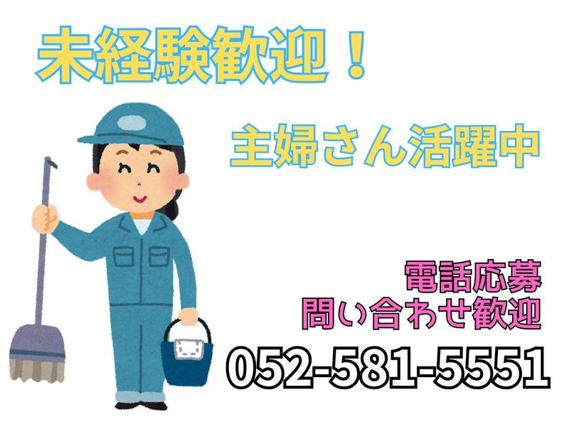 職種/仕事内容 | 仕事内容 \おそうじ応援隊 メンバー募集!/ テナントビル・オフィスビルで トイレや廊下・外周など清掃のお仕事です。 「おそうじ応援隊」として 名古屋市を主とした各現場にて 専任の清掃スタッフと一緒に 清掃作業をしていただきます。 *応援先は1日1ヶ所(日替わり) *移動は公共交通機関を利用 *遠方への移動時間も業務として給与支給 作業中は自分の仕事に集中できます。 作業が落ち着いた時には少し雑談をするなど オン・オフのメリハリのある職場です! 平日のみの勤務なので、家庭の用事との両立◎ 早朝・午前中の空いている時間を有効活用! 週2~5日で日数応相談! ◎応援業務がない日は 本社(名古屋市中村区名駅4丁目)に出勤いただき 雑務をお願いします。 ◇スタッフの声:主婦パートの清掃スタッフさん 「主夫・主婦歓迎」 「ホテルの客室清掃やビルの夜間清掃」などの条件で、 働きやすい職場を探していました。 清掃員の仕事は初めてでしたが、 ほかのスタッフと助け合って、 自分のペースで働いています。 |