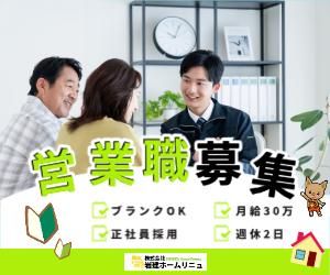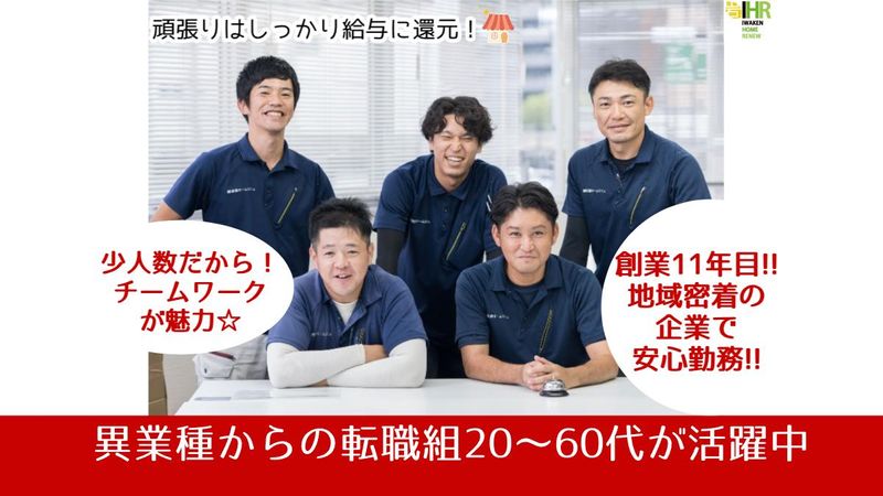 職種/仕事内容 | 仕事内容 \東京都足立区・北区エリアで住宅リフォームアドバイザーの募集です◎/ 創業11年を迎える弊社は地域密着で安心したアフターサービスを大切にしているリフォーム専門の中小企業です! 2025年度、新卒・中途ふくめ新しい仲間が増えていますが、 まだまだ新しい支店を増やしていきたいと思っており、更なる増員を予定しています! ・営業未経験OK →人と話す事が苦手でなければ問題ナシ! ・難しい知識やOAスキルは不要 →スマホ操作ができればOK! 専門知識は少しずつ覚えていけば大丈夫! ・年齢層が幅広い →活躍中の社員は20代~60代までと幅広いです! ・できるだけ稼ぎたい →結果が出た分お給料UPを目指せるのが営業職の特権! 年収1000万超も実現可能です◎ 【1日の流れ】※一例 8:30~ 出社・事務所内の清掃 9:00~ 朝礼 9:15~ 担当エリアに出発 工事状況などの確認 お昼休憩 近隣の御宅へご挨拶まわり アポイント調整 小休憩 チラシやタオルの配布 18:00~ 帰社 1日の振り返り・報告 終礼 慣れるまでは上司や先輩が一緒に動きます! 慣れてきたら日中は一人で動きます! |