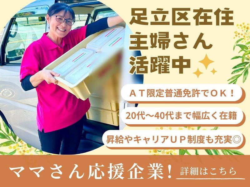 職種/仕事内容 | 仕事内容 企業へのお弁当配送のお仕事です! 足立区鹿浜の車庫で一度社用車に乗り替え、 担当エリアへの配送に向かいます。 1日あたり25~35件ほどを担当します。 【1日の流れ例/子育て中のママSさん✨】 ▼09:00 鹿浜の本社にてお弁当を車に積み込み ▼09:00~10:00 軽自動車orハイエースで配送! ▼12:00 配送終了、終了報告、休憩(日替わり弁当無料♪ ▼13:00 空き箱回収 ▼16:00 残業せずにお仕事終了!お疲れさまでした! ☕シングルマザー・ママさん多数活躍中!!  ̄ ̄ ̄ ̄ ̄ ̄ ̄ ̄ ̄ ̄ ̄ ̄ ̄ ̄ ̄ ̄ ̄ ̄ ̄ ̄ お子さんの成長や進学に合わせて、 働き方や収入の調整を相談できます✊ 「土日休みで平日だけ働く」 「稼ぎたいからコース組み合わせで!」 「扶養内におさめたい」など、 働き方は無限大!! 「子どものお休みは一緒に休みたいから 夏休み・冬休みはしっかり取りたいです!」 といった相談もOK! ☕頑張る方はしっかり評価✊  ̄ ̄ ̄ ̄ ̄ ̄ ̄ ̄ ̄ ̄ ̄ ̄ ̄ ̄ AT免許さえあれば未経験でも始められるお仕事! ✅頑張りに応じて給与アップ✨ ✅もっと頑張りたい方はキャリアアップも! ✅子育てが落ち着いたら社員になりたい!もOK✊ 勤続年数の長い方も多く、 柔軟な働き方が出来るから、 「子ども成長に合わせてパートを探し直さなきゃ…」 なども心配しなくて大丈夫です♪ ハローランチは頑張る方を応援します✨ |
