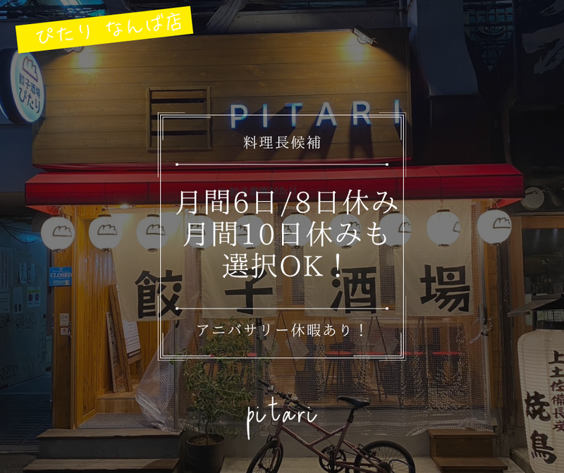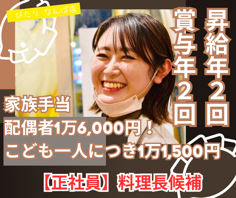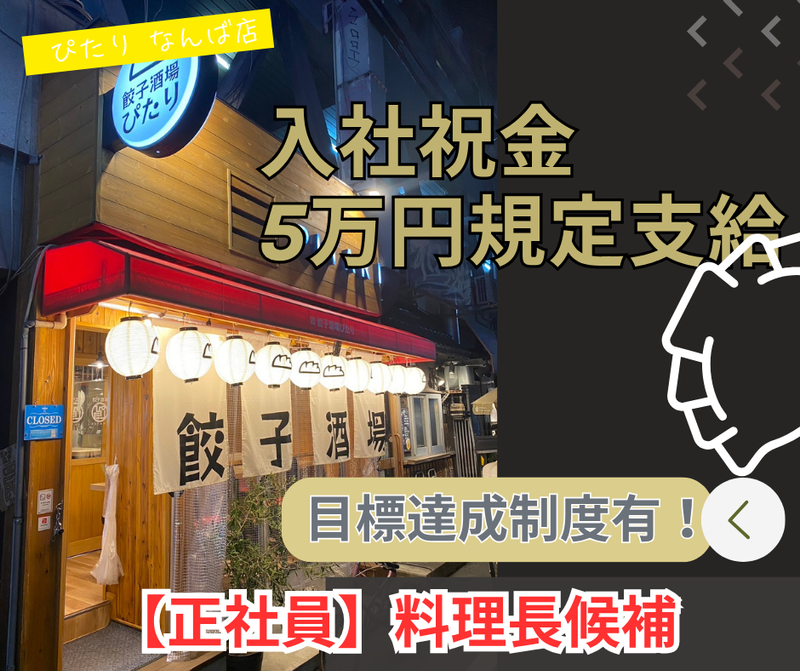 対象となる方 | 求めている人材 店長職として活躍頂ける方を求めています! 飲食業界経験者の方を特に求めています! ・フリーター・主婦(夫)大歓迎! ・これまでに接客や飲食店での経験をお持ちの方は特に大歓迎! ・経験が浅い方などは、早期に店長職として活躍して頂けるように しっかりと細かな部分までトレーニングしていきますので 是非、一緒に成長していきましょう! 【あなたの入社で!】 おかげ様で新コンセプト店としてスタートした「餃子酒場 ぴたり」の業態は 多くのお客様にファンとしてご利用頂いている人気店! そんな背景から、新規店舗をスグにでもオープンさせる計画が有ります。 ですが、新規店舗や既存の繁盛店を運営頂く店長が不足している現状が有ります。 ですから、あなたが入社し店長として活躍頂ければ、新たな新規店舗をオープンする予定です! あなたの応募を熱望します! |