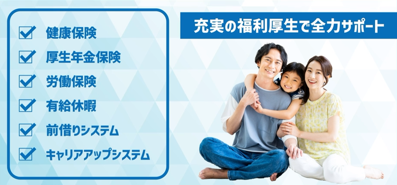 待遇・福利厚生 | 【保険制度】 雇用保険、労災保険、健康保険、厚生年金 【福利厚生】 待遇・福利厚生 【福利厚生】 *週払いOK(金曜締め・翌週金曜払い) *前払いOK(稼働分) *車通勤OK *交通費規定支給 *有給休暇 *正社員登用あり *1R寮完備(冷蔵庫、洗濯機、テレビ、電子レンジ付) *自転車、原付バイク貸出有り *送迎あり |