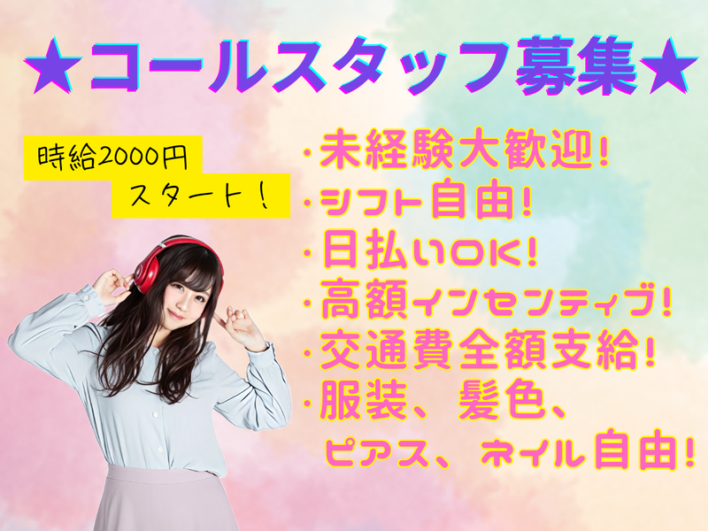 職種/仕事内容 | 仕事内容 アクセスしやすい通勤楽々の新宿で コールセンタースタッフを大募集◎ 【お願いするのは】 お客様へアンケートを取り、興味を持って頂く業務! アポが成立したら先輩に繋ぎます◎ インセンティブ制度が充実しています!! 架電リスト・マニュアル完備で安心♪ 稼働可能曜日 月火水木金土日(土日のみの勤務などもOK!) 稼働時間 9:00~21:00 1日3h~OK! 月間50時間~OK! 10代~30代のスタッフが活躍中! <Alive Japan合同会社について> 2022年1月に設立した、新しい会社です◎ 2024年10月から新オフィスへ引っ越したばかり♪ 少数精鋭のため自由度も高く、一人ひとりの裁量が大きいことが当社の特徴。 風通しも良く、働きやすい職場です♪ 成長企業で一緒に事業を成長させませんか? |