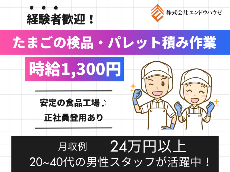 職種/仕事内容 | 仕事内容 ★おすすめポイント★ ✅ 日勤のみ(8:30〜17:00)で生活リズム安定 ✅ 月収例24万円以上可(残業含む) ✅ 食品工場で安定稼働&長期就業者多数 ✅ 20代〜40代の男性スタッフが多数活躍中 ✅ 現場リーダーや正社員登用のチャンスあり ✅ 経験・資格一切不問!体を動かす仕事が好きな方に最適 ◆ 安定の食品業界で、未経験から正社員も目指せる!◆ たまごの検品や箱詰めなど、シンプルな軽作業が中心。日勤専属&シフト制で予定も 立てやすく、残業も少なめ。 「安定収入」「定着率の高さ」「働きやすさ」が揃った人気の職場です。 ★仕事内容★ 食品工場内でのたまごのパック製品に関する作業をお任せします。 【検品作業】パックされた卵を目視でチェックし、ヒビなど不良品を除去 【積み込み作業】検品済みパック(約10kg)をパレットに手作業で積載 いずれも未経験から始められる作業です。現場スタッフが丁寧にフォローします ■急募 |