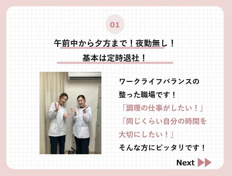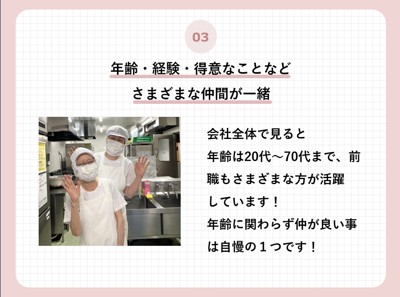 対象となる方 | 求めている人材 ■資格不問 ■経験不問 ■未経験歓迎 ■主婦・主夫歓迎 ■シニア応援 ■学歴不問 新しい仕事に チャレンジしたい方歓迎◎ ■栄養士や調理師免許のある方は 優遇します! 「自宅からの通勤アクセスがよかった!」 「このお仕事、ちょっと興味があるな!」 「待遇面に惹かれた!」など・・・ 応募理由はあなたにお任せします♪ ”堅苦しい応募理由”を 無理に考える必要はありません! ここで出会えたことも、きっと何かのご縁◎ まずはお気軽にお問い合わせくださいね♪ 1 安定収入を確保したい! 将来の備えや生活のために、 腰を据えてしっかり稼ぎたい。 生活の基盤を整えたい方。 経済的な安心感が欲しい方。 →正社員への登用もございます! 2. 工夫や改善を楽しみたい! 言われたことをやるだけでなく「こうしたらもっと良いかも」 と 自分なりに工夫したい方。 自分の仕事の手応えや貢献度を感じながら働きたい方 |