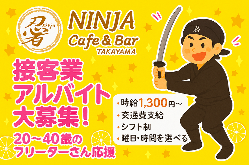 勤務地 | 忍者体験カフェ高山(株式会社I&E) 506-0011岐阜県高山市本町高山駅 |
