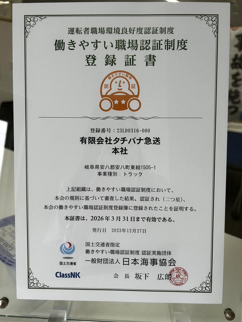 勤務地 | 有限会社タチバナ急送 岐阜県安八郡安八町東結1505-1 |