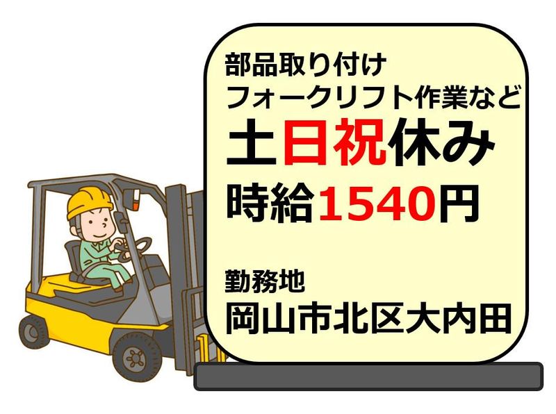 対象となる方 | 求めている人材 ・フォークリフト運転技能講習修了者 ・実務経験のある方歓迎! ・組付け作業の経験は不問です◎ ※ブランクありもOK ※フリーター歓迎 |