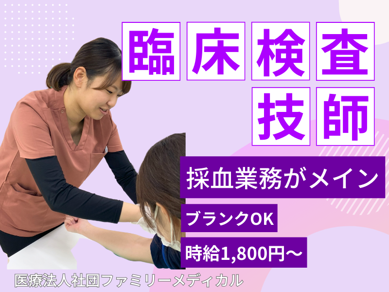職種/仕事内容 | 仕事内容 採血メイン! その他、採血準備および器具の管理など。 必要に応じて、呼吸機能検査など行っていただきます。 (しっかり指導させて頂きますのでご安心ください!) 「ブランクがあって心配・・・」 「過去に病院やクリニックでの採血経験がある」 そんな方におすすめです! 当院は神奈川・東京に4院を展開する呼吸器専門クリニックです。 予防医療に注力し専門性の高い医療を地域密着で提供しています。 「患者さんと全職員の幸福の追求」を診療理念に掲げ、 学びながら楽しく働くための環境が整っています。 人間関係が良好で風通しが良いのも当院の自慢です♪ 不安なくお仕事に復帰できるよう、丁寧にサポートします。 あなたのスキルを活かして、私たちと一緒に働きませんか? ご応募をお待ちしております! |