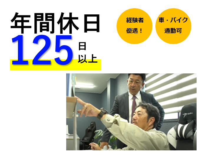 休日休暇 | 休日休暇 土日祝休み 盆、年末年始、GW ★原則週休2日ですが、現場の施工状況によって異なる場合あり 年間休日:125日 有給休暇(6ヶ月経過後の年次有給休暇日数:10日) |