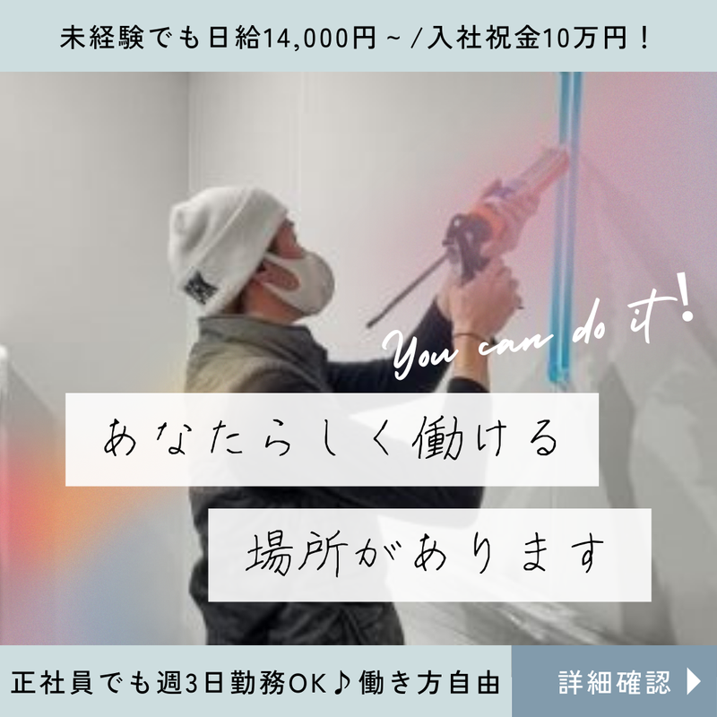 職種/仕事内容 | 仕事内容 <当社で働くメリット> ✅正社員ながら週3日勤務もOK♪ ┗あなたの生活スタイルに合わせた働き方ができます♪ 残業無し◎原則定時退社です! 「いまは子供に手がかかるので毎日は働けない…」 「プライベートを大事にしたい!」 そんな方達も大歓迎です!! ✅現場仕事ですが力仕事ではありません!! ┗外壁や窓のつなぎ目をシーリング剤で埋める作業をお任せします◎ 重いものを持ち上げたりといった仕事は無いので 「体力に自信がない…」といった方もご安心ください☆ ✅お洒落も楽しみながら働けます★ ┗ヒゲ・ピアスOK!髪色自由です♪ 自由度の高い企業です! ✅福利厚生もバッチリの従業員想いの会社です! ┗社宅・家賃補助制度もあるのでIUターンの方にも! 試用期間(3ヶ月間)を終了したらうれしい入社祝金10万円を支給! ================== 【具体的には】 建物の柱や梁の腐朽や鉄筋の錆の発生を避けるために シーリング工事を行い、建物外部からの水の侵入を防ぎます。 私たちの仕事は建物を造るうえで 無くてはならない工事工程を担っており 安定して需要があります◎ |