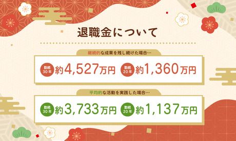 給与 | 月給200,000円以上 給与 月給 20万円以上 (一律手当を含む) +諸手当+賞与年2回 ※給与は能力により異なる 【正職員の平均給与例】 月給45万6000円(2023年度実績) ※給与は年間平均の税込定例給与。 ※賞与は含みません。 【退職金について】 退職一時金は勤続3年以上、 退職年金は勤続15年以上で 受給資格が得られます。 退職金の支給倍率は勤続年数とともにアップ! 長期間勤務すればするほど、 もらえる退職金も増えていきます。 「退職金が仕事のモチベーションになっている」 という社員もいるほどです。 ※詳細は企業福利厚生プランナー採用サイト(https://www.daido-life-saiyo.com/corporate-benefits-planner/salary.html)をご覧ください。 |