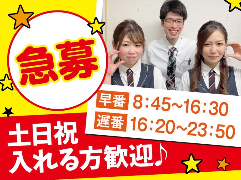 勤務時間 | シフト制 勤務時間詳細 【早番】 時間▶8:45~16:30 *土日祝半分以上入れる方 【遅番】 時間▶16:20~23:50 *週2~5日の勤務で相談OK! ┗平日のみOK!土日のみOK! *Wワークなどで16:20開始が難しい場合、ご相談ください! |