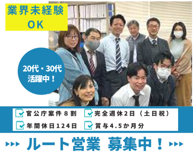 職種/仕事内容 | 仕事内容 <建設コンサルのルート営業> 官公庁案件8割で社会に自分の仕事が残る喜びを味わえる! 【具体的には】 建設コンサルタント営業は、 公共インフラ(建物ではなく、橋梁や道路など土木関係の建造物)の整備を 行政にはたらきかける営業です。 ◆お任せしたいお仕事  ̄ ̄V ̄ ̄ ̄ ̄ ̄ ̄ ̄ ̄ ̄ ̄ ̄ ̄ ̄ ̄ ̄ ̄ 官公庁(既存のお客様)を中心としたお客様を定期的に訪問。 近況確認や情報提供していく中で、ニーズやお困り、ご要望をくみ取り、 技術部門と協力して、調査や企画・ご提案を行います。 案件は、 インターネットの入札情報から見つけたり、 場合によっては依頼が来ることもあります。 ◆働き方  ̄ ̄V ̄ ̄ ̄ ̄ ̄ ̄ ̄ ̄ ̄ ̄ ̄ ̄ ̄ ̄ ̄ ̄ 一日のスケジュールはご自身の進めやすいように調整できます。 訪問7割、入札や情報収集等の事務作業が3割。 官公庁案件がメインなので、休日出勤や定時後のやり取りも基本はありません。 ◆この仕事のやりがい  ̄ ̄V ̄ ̄ ̄ ̄ ̄ ̄ ̄ ̄ ̄ ̄ ̄ ̄ ̄ ̄ ̄ ̄ お客様との関係性構築や、技術部門との連携など、 それぞれとのコミュニケーションが大事になるお仕事です。 社会的インパクトの大きな案件に携わることができるので、 受注につながったときは、大きなやりがいも実感できます。 仕事の流れ(入札をする場合の一例) ******************************* ▼官公庁や自治体の入札情報の収集(インターネットや技術部からの情報提供) ▼入札に必要な見積り作成 入札に参加する案件を精査し、見積り作成 ▼受注後のあいさつと契約交渉 ▼場合により技術部門と共に現場へ同行 お客様と現場をつなぐ役割をお任せします。 ▼納品・請求書発行 <案件例> ●道路・橋梁・河川・上下水道などのインフラにかかわる調査設計 ●自衛隊・米軍基地など防衛関連施設 ●公園・工業団地・ショッピングモールなどの開発 ●都市計画・まちづくりに関わる企画提案 ●トンネルや橋梁などの維持管理 など ===================== 上場企業ならではの安定した環境 ===================== ・年間休日124日 ・完全週休2日(土日祝休み) ・ノー残業デーあり ・賞与4.5ヶ月分 公共事業を通じて社会貢献したい という思いがあれば、きっとご活躍頂けます。 ===================== 対人スキル、現場の知識が身につく! ===================== 官公庁や自治体などのお客様はもちろん、 社内の技術担当と一緒に動く機会も多く、 幅広い現場のことを知れる仕事です。 大規模なプロジェクトも多いため、 関わる人の数も多く、お客様と 現場をつなぐ役割としてさらに 対人スキルを身につけられます! |