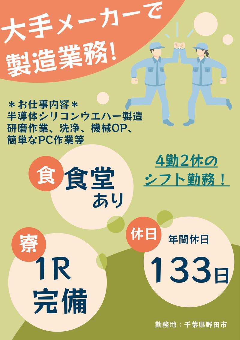 職種/仕事内容 | 仕事内容 ◆━━━━━━━━━━━━━━━━━━━━━━━━━━━━━◆ 300ミリシリコンウェハの製造、研磨作業、洗浄作業など機械OP ◆━━━━━━━━━━━━━━━━━━━━━━━━━━━━━◆ ◆ どんなお仕事?◆ スマホやパソコン、家電、自動車など、今の生活に欠かせない“半導体”。 その半導体の「もと」となるのが、シリコンウェーハと呼ばれる丸くて薄い板です。 機械のボタン操作やチェックが中心なので、未経験の方でも始めやすい内容です! ◆ お任せする主な作業内容◆ ・機械のボタン操作(オペレーター) 製造ラインには、シリコンウェーハを加工するための専用機械があります。 ・表面をツルツルにする「研磨」作業 できあがったウェーハの表面を、特別な機械を使ってピカピカに仕上げます。 ・洗う作業(洗浄) 加工したあとのウェーハを、薬品やきれいな水でしっかりと洗います。 汚れが残らないようにする、大事な工程です。 ・チェック作業(検査) 完成したウェーハにキズがないか、決まったポイントを見て確認します。 ・データの入力 機械がどのくらい動いたか、製品の状態などを、パソコンに入力します。 ◎未経験の方でも安心スタートが可能◎1ヶ月程で慣れる方がほとんどです! ★勤務時間は長めとなりますが、休憩時間がしっかりと確保されているため安心! ★交代シフト配属後は休憩2.5時間中、1時間は有償休憩となるので、毎日休憩して1時間分の時給が支給されます! ★残業もあり!稼ぎたいかた必見の職場です! ☆むずかしい作業ナシ!未経験でも大丈夫! 手順通りに進めればOKな作業ばかりなので、工場が初めての方も安心です。 先輩がそばでサポートしてくれるので、少しずつ慣れていけます。 ☆モノづくりの最前線で働ける! あなたが作ったウェーハが、世界中のスマホや自動車などに使われます。 「見えないけど役に立っている」そんなやりがいを感じられる仕事です。 《働きやすさバツグン♪》 ご経験やスキル習得のスピードに合わせてお仕事をお任せいたします! スタッフ同士の仲も良く、分からないことがあっても聞きやすい雰囲気! 自己成長もしやすい環境です。 ◎他詳細は、面接時にお伝えいたします。 ◇◆お仕事探しはFMCへ◆◇ ・自分に合った職場で働きたい ・納得のいく仕事選びをしたい ・ライフワークバランスを大切にしたい そんな願いを、私たちFMCと一緒に叶えませんか?!★ |