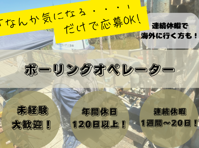 職種/仕事内容 | 仕事内容 \\ 求人のポイント // ⏩マニュアル免許があれば未経験OK!! ⏩宿泊手当あり!朝・夕食事付き◎ ⏩年間休日120日以上!連続休暇取得可能♪ ⏩住宅手当など充実の福利厚生☆ 【⭐仕事内容】  ̄ ̄ ̄ ̄ ̄ ̄ ̄ ̄ ̄ ̄ ̄ ̄ ̄ ̄ ̄ ̄ ̄ ̄ 防災分野では大地震の原因となる 活断層や不安定な斜面の調査、 建設分野ではインフラ・建造物を 安全かつ合理的に建てるための調査を 行っています。 地下の地盤(土・岩・地下水)の 状況を把握するため、足場を架設して ボーリングマシンを用いて、 試料採取を行います。 また、海上においては 台船や特殊足場架設を用います。 具体的には・・・ ✅足場の組み立て ✅ボーリングマシンの設置 ✅地盤の試料を採取。 ✅採取した試料の管理・記録 など ※現場によっては宿泊を伴う出張もあります ┝・出張手当&宿泊手当あり/食事付 └・日数に応じて日当UP! 【⭐当社について】  ̄ ̄ ̄ ̄ ̄ ̄ ̄ ̄ ̄ ̄ ̄ ̄ ̄ ̄ ̄ ̄ ̄ ̄ 新和ボーリング工事株式会社は、 海上地質調査を専門とする会社です。 地下の地盤状況を正確に把握することは、 安全な建造物の建設や防災対策において 非常に重要な役割を担っています。 当社では笑いありのアットホームな 職場環境で、チームワークを大切にしながら 日々の業務に取り組んでいます。 当社のSNSをご覧いただければ、 職場の雰囲気を掴んでいただけると思います。 【⭐希少価値の高い技術】を習得できる  ̄ ̄ ̄ ̄ ̄ ̄ ̄ ̄ ̄ ̄ ̄ ̄ ̄ ̄ ̄ ̄ ̄ ̄ 海上地質調査を専門とする会社であり、 他では得られない専門スキルを 実践を通じて学べます。 この経験は「他の作業員との差別化」 につながり、将来のキャリアの幅を 大きく広げます。 【⭐未経験OK!学歴・経験不問!】  ̄ ̄ ̄ ̄ ̄ ̄ ̄ ̄ ̄ ̄ ̄ ̄ ̄ ̄ ̄ ̄ ̄ ̄ 経験や学歴は問いません。 入社後は先輩社員が丁寧に指導しますので、 未経験からでも安心してスタートできます。 機械(車、バイク、エンジンなど)を 扱うことが好きな方や、細かい作業が 好きな方には特に面白いと感じていただける 仕事だと思います。 各機械やボーリングマシンを使用するため、 力仕事だけではなく技術や知識も 必要となります。 【⭐入社後のキャリアパス】  ̄ ̄ ̄ ̄ ̄ ̄ ̄ ̄ ̄ ̄ ̄ ̄ ̄ ̄ ̄ ̄ ̄ ̄ 入社後は先輩社員のサポートから始め、 徐々に技術を習得していきます。 各種資格取得のサポートも行っており、 取得した資格はお給料に反映されます。 経験を積むことで、現場責任者として 活躍することも可能です。 当社では学歴、年齢、前職などは問わず、 本人の貢献度や実績次第で評価する 方針を取っています。 【⭐年休120日!プライベートも充実】  ̄ ̄ ̄ ̄ ̄ ̄ ̄ ̄ ̄ ̄ ̄ ̄ ̄ ̄ ̄ ̄ ̄ ̄ 当社カレンダーによる休日制度を 採用しており、月に7日~13日の 休みがあります。 GWやお盆、年末年始をはじめ、 年度末特別休暇もしっかり休めます! 連続休暇の取得も可能で、 1週間~20日間の長期休暇も取得できます。 1年目から計120日間の休日があり、 ワークライフバランスを重視した 働き方が可能です✨ 【⭐充実の福利厚生で働きやすさ◎】  ̄ ̄ ̄ ̄ ̄ ̄ ̄ ̄ ̄ ̄ ̄ ̄ ̄ ̄ ̄ ̄ ̄ ̄ 入社後は、長く活躍してもらいたいと 思っています。 そのため、熱中症対策手当(7月~9月)や 若年奨励金、住宅手当(規定あり)など 各種手当をご用意しております。 また、入社時に引っ越しをされる場合は 初期費用を会社が負担します。 お気軽にご相談ください! |