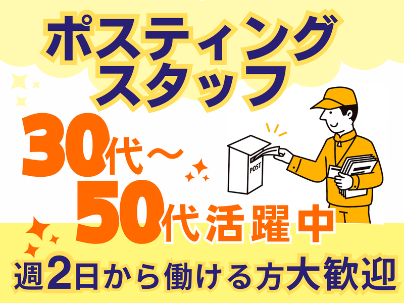 職種/仕事内容 | 仕事内容 ✨最寄り駅で現地集合・解散可能 ✨30~50代スタッフ活躍中‼ ✨週2~勤務できる方大歓迎♪ \WEB応募は24時間受付中♪/ 氏名・生年月日・連絡先のみでOK! お気軽にご応募ください! 【 仕事内容 】 移動型の「キャラバン部隊」の一員として ポスティング作業をお任せします! 【お仕事の流れ】 ⏩配布現場へ移動 チームリーダーが運転する車両で 現場周辺へ移動します。 ⏩現場に到着 ポスティング開始! まずはリーダーが数日間同行します◎ 研修後は、基本的1名での作業です。 ⏩解散 ================ ⭐運転免許不要! 移動は弊社の車両を使用し、 運転はリーダーが担当します。 スタッフは同乗するだけで OKなので安心です◎ 【 ポスティングエリア 】 主に横浜市エリアAの 京急沿線・市営地下鉄沿線が 主な現場となります。 ▼横浜市エリアA 中区、南区、港南区、磯子区、 金沢区、栄区 ▼横浜市エリアB 西区、鶴見区、都筑区、 保土ヶ谷区、緑区、青葉区、 戸塚区、神奈川区、港北区 ▼横浜市エリアC 瀬谷区、泉区、旭区 ※稀に大和市・藤沢市・近郊市あり ※勤務地は日々異なります。 / 集合・解散もスムーズ✨ \ 最寄りの駅にて 現地集合・現地解散となるため、 通勤の負担も少なく、 スムーズに業務に取り組めます◎  ̄ ̄ ̄ ̄ ̄ ̄ ̄ ̄ ̄ ̄ ̄ ̄ ̄ ̄ ̄ ̄ ̄ ※面談の際は、 写真付き履歴書をご持参ください。 また、ご契約時には 身分証明書と印鑑が必要となりますので、 併せてご用意をお願いいたします。 |