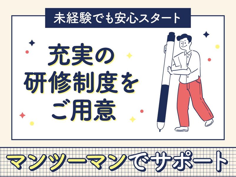 試用期間 | 試用期間あり 試用・研修期間:2週間(習得状況により前後する場合あり) 試用・研修期間の条件:本採用と同じ <研修> 随時開始 ※開始日は面接時にご相談ください。 研修は1対1のマンツーマン形式で実施するため、質問もしやすく自分のペースで習得できます。入社後数年経過してからでも、業務内容で不明点が出てきた場合には再度研修を受けられる手厚いサポート体制が整っているので安心◎何か困ったことがあれば、組織全体で改善に向けて全力で取り組んでくれるので、長く安心して働ける環境です* |