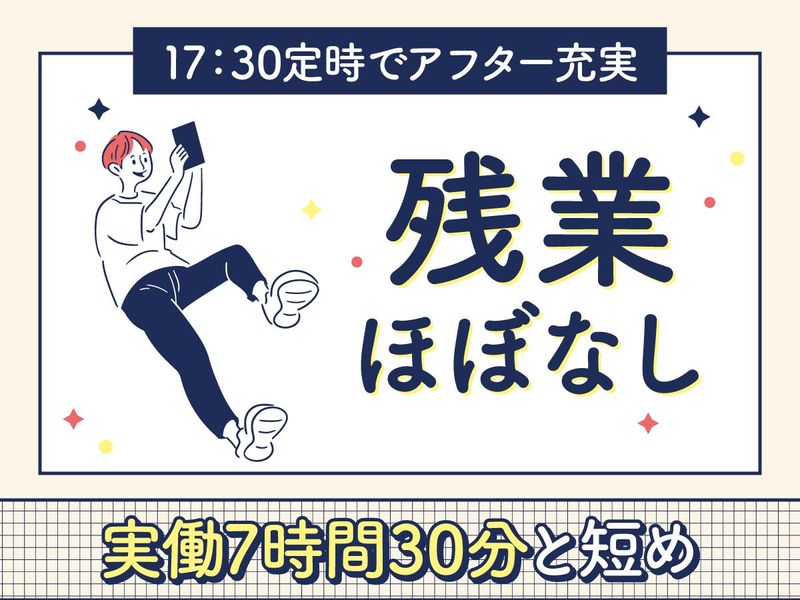 勤務時間 | 固定時間制 勤務時間詳細 <勤務日数> 平日のみ週5日 <勤務時間> 9:00~17:30(実働7時間30分) |