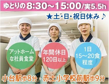 職種/仕事内容 | 仕事内容 \働く方に楽しい食事を/ 安心の大手企業内の 小規模社員食堂♪ 【勤務地】 都電荒川線/小台駅歩8分 舎人RN/赤土小学校前駅歩9分 JR/尾久駅歩12分 (荒川区西尾久一丁目) ◎調理スタッフさん募集! (調理経験等活かせます) <ここもポイント♪> 1日15~20食程度の調理! ★☆定食1種類☆★ 【具体的には】 ・献立表に沿った昼食の調理 (日替わり定食1種類) ・仕込み、盛付け、提供 ・簡単な事務など 【勤務時間・曜日】 8:30~15:00/休1h・実5.5h ★月~金曜/週5日(祝休み) 【休日・休暇】 完全週休2日制(土・日・祝) GW・年末年始・他企業カレンダー ★年間休日120日以上でオフも充実♪ (お子様のいらっしゃる方にも大好評) ◆ゆとりの勤務も人気! (月収/15万2460円以上可) 【社員食堂で働くメリット】 ✅働き易く安定した勤務時間♪ 社員食堂は企業の営業時間等に合わせて運営されており、中でも平日のランチタイムが中心です♪ ✅お客様は常連(社員やスタッフさん等) 社員食堂のお客様はその企業で働く社員やスタッフさんがほとんどなので、とてもアットホームな環境です♪笑顔いっぱいの「美味しかったよ~」「ごちそうさま」も大きなやりがいです♪ ✅嬉しい食事補助(美味しい賄い)♪ 昼食代節約&お弁当の手間も不要♪ ✅ご家庭での調理にも役立つスキル 調理方法や衛生管理の知識もゲット! ✅他、飲食業等とは異なる休日♪ 各企業等の休日と合わせる社員食堂がほとんどなので、土・日・祝日やGW・年末年始休暇もあるのが特徴です。 【当社概要】 ・企業事業所給食/首都圏約200店舗! ・ISO14001取得 |