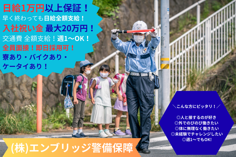 職種/仕事内容 | 仕事内容 【シンプル&安心の交通誘導!日勤・夜勤スタッフ大募集!10代〜70代まで幅広い年代が活躍中◎】 道路工事や建設現場において、歩行者や車両の安全を守り、スムーズな通行をサポートする交通誘導警備のお仕事をお任せします。 「高日給の夜勤で稼ぎたい」「退職後のセカンドキャリアを探している」「人と穏やかに接する仕事がしたい」といった方に最適な、シンプルで安心のワークスタイルです! ◆具体的なお仕事内容 お任せするのは、挨拶と道案内が中心です。 例えば、、 ■工事現場付近で、安全確認と通行ルートのご案内 ■「足元お気をつけください!」「こちらからお通りくださいね!」と歩行者へ優しく声をかけ、安全な通行をサポート ■車両へ停止や徐行などの合図による安全確保 重い荷物を運んで体力を使うといった作業はほとんどありません!さらに約2時間ごとに15~20分の休憩が取れるので、体に無理なく安心して働けます◎ \エンブリッジ〝ならでは〟がたくさん♪/ ■学歴・経験不問。9割以上が未経験スタート!20代〜70代の幅広い世代が活躍中◎ ■募集エリア周辺にも案件多数!だから、自分の都合がシフトに反映されやすい! ■日当全額保証!たとえ仕事が1時間で終わっても日給は全額お支払い♪ ■日払い・週払い・即日払いOK! 急な出費の時も安心◎ ■週1日、月1日~OKだから、Wワークや気分転換にもぴったりな環境! ■約2時間ごとに15~20分の休憩があり、体に無理なく働けます♪ ■法定研修20時間をしっかり実施。未経験の方でも安心してスタートが可能! ◆スタッフの声(一例) 「最初は『自分にできるかな?』と不安もありましたが、体調や家庭の事情もきちんと相談に乗ってもらえて、無理なく続けられています。急な出費のときも日払いができて安心。困ったときも現場の先輩が親身に話を聞いてくれるので心強いです!」 「今週は夜勤でガッツリ稼ぎたい」「家族の通院に合わせたい」など、生活ペースに合わせた働き方が可能です! 夜勤・深夜・早朝の勤務もあります! \ココが違う!エンブリッジの充実待遇/ ■入社祝金最大20万円支給!(規定あり) ■現場完遂手当あり(現場隊長は1現場の完工ごとにプチボーナス!) ■資格取得費用は全額会社負担!取得後には手当もしっかり支給◎ ■制服、リュック、空調服や防寒ベストを無償貸与(保証金も一切なし) ■即日入居OKの寮を完備!さらにスマホ貸与(プライベート利用OK)、各種社割、傷害保険など福利厚生も充実◎ ■社員登用&キャリアアップ制度も充実(例:管制官・責任者など実績多数あり)。 |