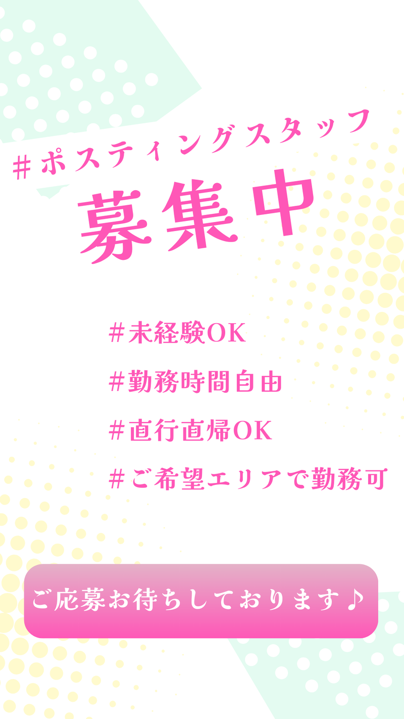職種/仕事内容 | 仕事内容 【お仕事内容】 愛知県内お近くのエリアで集合住宅のポストへインターネットサービスのお知らせチラシを配っていくお仕事です! 専用地図を用いて、賃貸アパート、マンションへチラシを投函するだけ♪ アパート、マンションのポストへの投函なので、非常に効率よく配布することが出来ます。 難しいスキルは一切必要なく、男女問わず幅広い年代の方が活躍中です! 勤務時間は自由♪ 時間の縛りはないので、空いた時間に好きなタイミングでお仕事可能です。 |