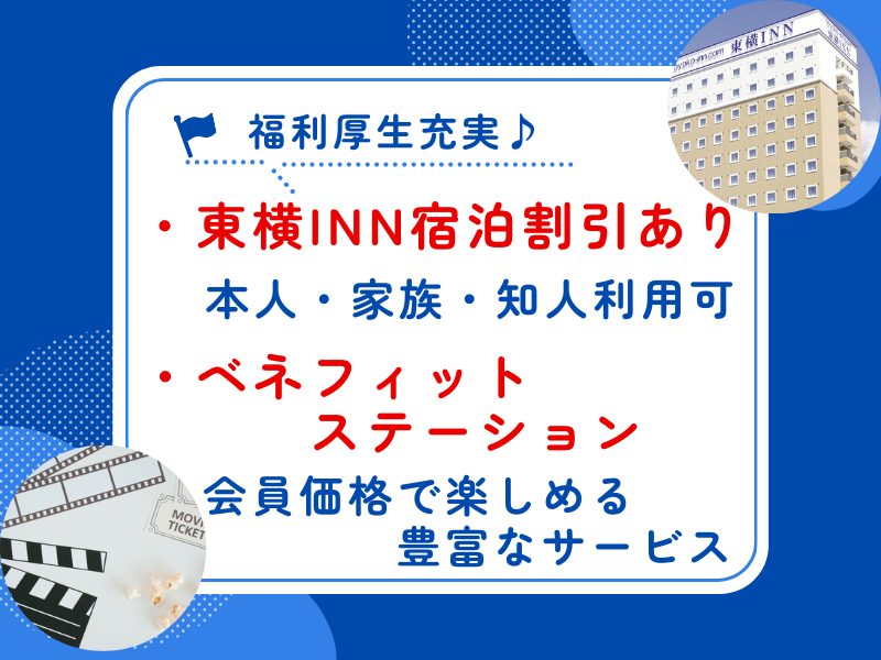 待遇・福利厚生 | 【保険制度】 雇用保険、労災保険、健康保険、厚生年金 【福利厚生】 待遇・福利厚生 【福利厚生】 *社会保険完備 *制服貸与 *有給休暇(半年以降付与) *宿泊割引 └全国の東横イン本人30%・家族知人20%割引 *福利厚生制度 └宿泊施設・美容・映画・グルメ・スポーツジム・レジャー施設・ライフサポートなど 約140万件以上の幅広いサービスを会員価格でお得に利用できる 「ベネフィット・ステーション」利用可能 ※ご本人だけでなく、ご家族もお好きなだけ利用可能です |