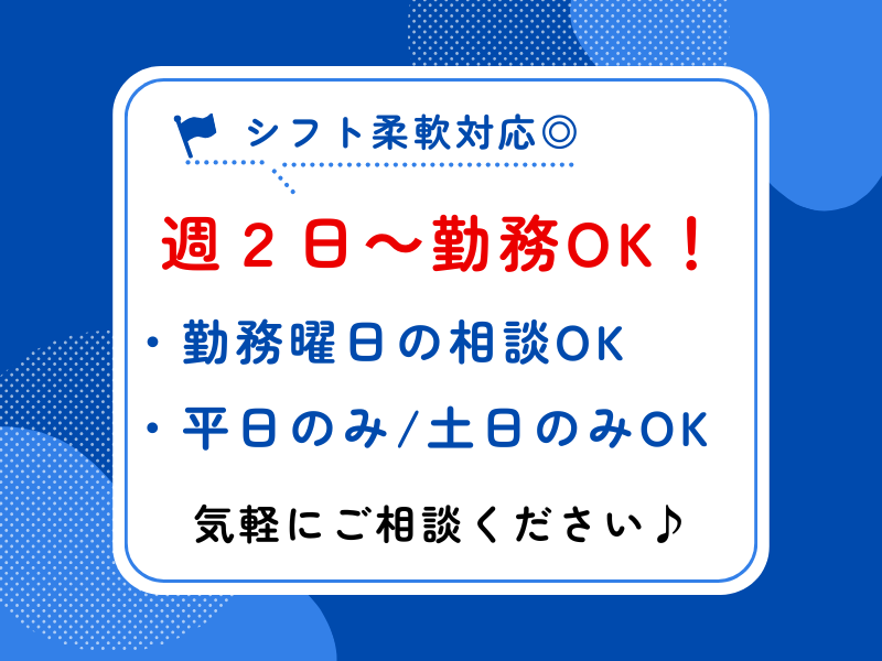 勤務時間 | シフト制 勤務時間詳細 ■勤務時間:10:00~16:00  ̄ ̄ ̄ ̄ ̄ ̄ ̄ ̄ ̄ ̄ ̄ ̄ ̄ ̄ ̄ 時間キッチリ!残業はほぼありません 出勤ラッシュとは無縁の10時~スタート ■週2日~勤務OK(曜日相談OK)  ̄ ̄ ̄ ̄ ̄ ̄ ̄ ̄ ̄ ̄ ̄ ̄ ̄ ̄ ̄ ̄ 平日のみ・土日のみなどもOK! 私生活×仕事が両立しやすい環境で、 みんなノビノビ働いています! 週2日から始めて慣れてきたら、 週3、4と増やしていくのもOK◎ |