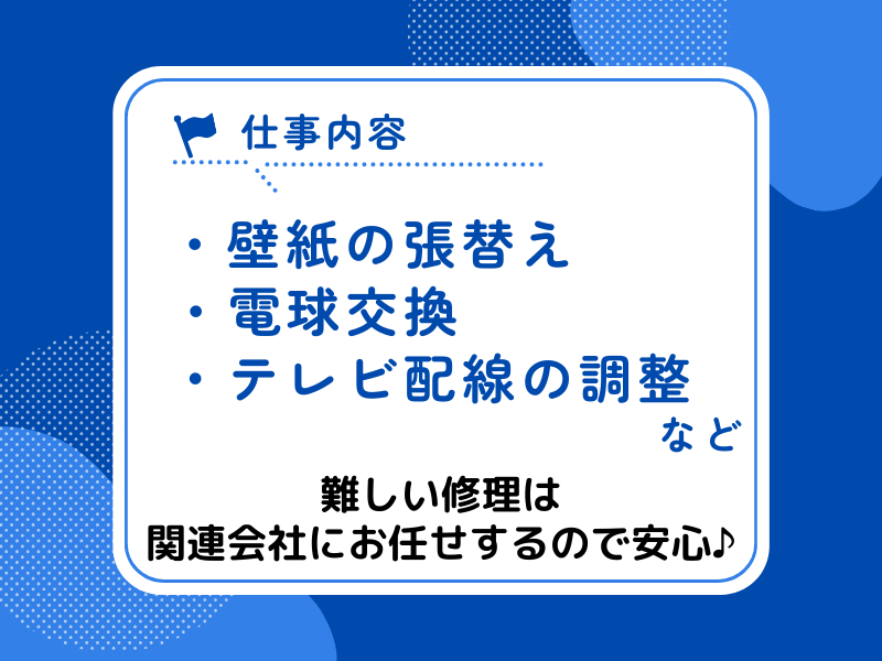 対象となる方 | 求めている人材 要電気工事士資格 - 年齢不問 <以下のいずれかに当てはまる方尚歓迎> ・DIY・機械いじりが趣味な方大歓迎 ・壁紙など内装のリペア経験がある方 ・水回り設備の修理経験がある方 ・手先の器用さには自信がある ・趣味が日曜大工 ・ボイラー技士資格者 |