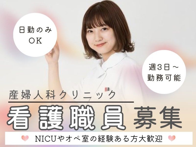 職種/仕事内容 | 仕事内容 産婦人科クリニックでの看護業務【病床数:19床】 ・検査や診察の補助 ・各種処置 ・新生児の観察やケア ・記録作成 など 快適な出産の準備である妊婦健診はもちろん、不妊症で悩んでいらっしゃる方には最先端技術である顕微授精、受精卵凍結保存を含めた生殖補助医療を行っております。 業務拡張に伴う増員募集!特にNICUやオペ室での勤務経験がある方大歓迎です◎ 【在籍職員数】産婦人科医3名、助産師17名、看護師17名、看護助手3名 まずはお気軽にお問合せください! ★登録時はメールやLINEで履歴書のやりとり可♪履歴書の写真を撮って送るだけでもOK! ★顔写真不要です♪ |