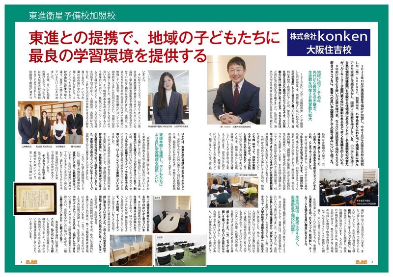 職種/仕事内容 | 仕事内容 当社は、大阪市内で長年親しまれている地域密着型の学習塾「konken」を運営する企業です。 2023年には「東進衛星予備校 大阪住吉校」の運営をスタート。 映像授業を活用した東進衛星予備校では、 生徒や保護者の相談役となることで、生徒の夢の実現をサポートします。 「授業をしない塾運営」という新しい形の教育支援を提供するポジションを募集いたします! \授業スキルは不要!/ 映像授業のシステムが整っているため、教科を直接教えることはありません。 生徒や保護者に寄り添う姿勢が、この仕事で何よりも求められる能力です。 具体的には… ◇生徒指導 ∟学習計画(カリキュラム)の作成 進路相談や面談を通じた個別サポート 生徒の出欠管理 ◇スタッフマネジメント ∟担任助手の管理・育成 教室全体の運営体制の強化 ◇保護者対応 ∟受講プランの提案 受験情報の共有を通じた信頼関係の構築 ◇その他教室運営関連業務 ∟日々の教室の雰囲気づくり 生徒のニーズを把握し、新しい施策を検討 ◇イベント企画・運営 ∟生徒向けガイダンス、模試運営 保護者向け説明会の企画・実施 当社で働く魅力✨ ⏩キャリアアップのチャンス ∟まずは教室運営スタッフとしてスタートしますが、将来的には校舎長としての昇格が可能です。 校舎長として運営全体を指揮する責任を持ちながら、リーダーシップを発揮する場が用意されています。 ⏩地域貢献と自己成長の両立 ∟地域密着型の運営を行う当社では、生徒や保護者との交流が深く、成果を実感しやすい環境です。 教育を通じて地域社会に貢献しながら、あなた自身も成長できる場を提供します。 ⏩ライフワークバランスを重視 ∟残業がほとんどない職場環境や年間休日115日など、長く安心して働ける体制が整っています。 オンとオフのメリハリをつけながら働けます。 【教室案内】 ・墨江本部教室/大阪市住吉区墨江2-3-53(2025年4月建て替えリニューアル) ・墨江第2教室/大阪市住吉区墨江2-5-55 ・沢之町教室/大阪市住吉区殿辻1-5-16 ・沢之町第2教室/大阪市住吉区沢之町1-1-20 ・粉浜教室/大阪市住之江区粉浜西3-1 ・東進衛星予備校(大阪住吉校)/大阪市住吉区殿辻1-5-16 |
