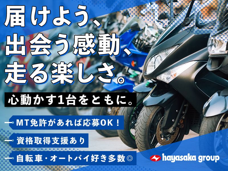 職種/仕事内容 | 仕事内容 \自転車・オートバイ好き大歓迎/ 地域に愛される店舗を目指して、 新車・中古車・輸入車販売や修理、 レンタルバイクの貸出(取扱店舗)を 手がけるバイクショップです。 ================ POINT ✅クルマのAT免許があれば未経験OK! ✅資格取得支援でスキルアップ可能! ✅社内研修・メーカー研修あり ✅オンライン面接もOK 自転車・オートバイ好きなスタッフ多数! 休みの日に一緒に走りに行くことも! 各種メーカーの正規販売店のため、 正確でより深い知識を身につけて プロとして活躍することができます〇 ================ <仕事内容> ●自転車やオートバイの販売 ・接客 ●レンタルバイクの貸出対応(取扱店舗) <その他> 販売情報のPC入力(販売管理) 店舗美化・プライスカードなどの店舗運営 お客様対応(点検案内やイベントのお誘い) 各種イベントの企画・運営 など <取り扱い車種> 国産:ホンダ・ヤマハ・スズキやカワサキ 外車:ハーレーダビッドソン・ハスクバーナ など |
