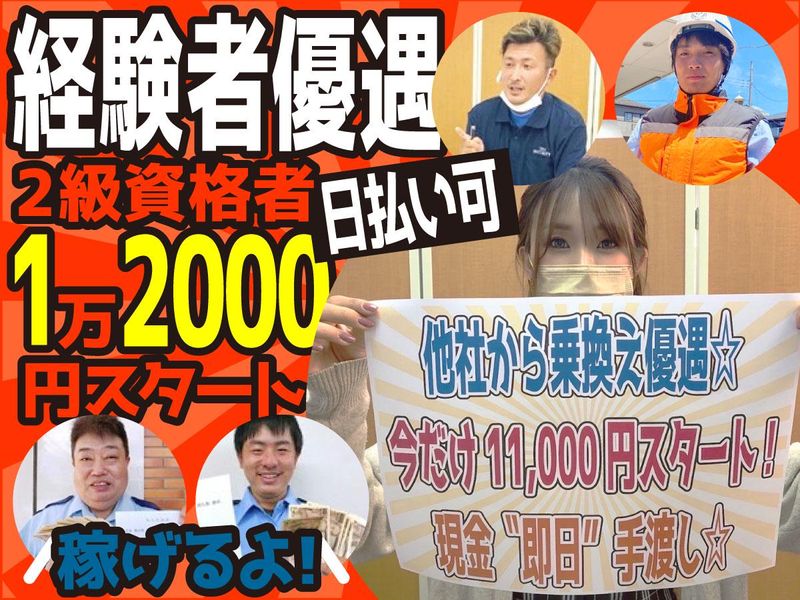 対象となる方 | 求めている人材 18歳以上(警備法による) 大学生歓迎 【大量募集!交通誘導警備員!】 現スタッフは「さいたま市」「上尾市」「桶川市」など埼玉県央エリアや、 「川越市」「鶴ヶ島市」「坂戸市」「日高市」「ふじみ野市」「富士見市」「毛呂山町」「越生町」の東上エリアや、 「所沢市」 「飯能市」「入間市」「狭山市」の西部エリアなどから通っている方が多数います。 【宮原完全新規オープンスタッフ大募集!】 さいたま市北区、さいたま市西区、さいたま市大宮区、さいたま市見沼区、さいたま市岩槻区、上尾市、桶川市、北本市、鴻巣市、行田市、羽生市、加須市、久喜市、白岡市、伊奈町、蓮田市、宮代町、杉戸町、幸手市のお仕事多数! 近隣エリアからのご応募大募集中! 【様々な経験が活かせます】 ・体育会系(運動経験者・コーチ・監督・教育者など) ・接客業(ファミレス・飲食店など) ・営業(広告代理店・ルート・メーカーなど) ・現場系(建築業・建設業・土木作業員・電気工事士・解体業・リフォーム・造園・足場作業員・鳶職人など) ・ドライバー系(配送ドライバー・軽貨物ドライバー・トラックドライバー・タクシー運転手など) 経験者の方、自分を変えてみませんか??? 事業拡大をどんどんしていくので、【チャレンジ】してみませんか? 幹部候補として弊社で迎えます!むしろアナタの為に空けておきます! |