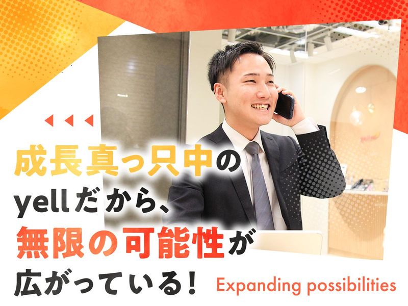 職種/仕事内容 | 仕事内容 ――――――――◆◇◆―――――――― yellで働く魅力! ――――――――◆◇◆―――――――― これまで18,000社以上の企業様を支援した実績を誇る当社は今年で設立10周年! 社員数・支社数・売上も右肩上がりに伸ばしています。 ↓↓ そんなyellの特徴とは… ↓↓ ☆★成果を上げれば上限なく評価★☆ 学歴や経験、前職は“一切”関係ありません。 あなたの「これからの頑張り」を きちんと評価しているからこそ、 早期キャリアアップが叶えられます! 実際に・・・ ★経験2年・20代でリーダーに! ★経験3年・20代でサブマネージャーへ!等 多くの社員が早くに次のステップへと進んでいます。 ☆★ワークライフバランスも大切に★☆ ムダな残業をさせない管理が徹底しており、 19時には完全退社するように 会社全体で取り組んでいます! さらに、年間休日125日+有給5日以上で メリハリをもってご活躍いただけます! \\ 人からはじまる「+1」// Indeedパートナーとして「+1」を大切にし、個の成長=事業成長を通じてお客様の企業成長の実現を一緒に目指しましょう♪ 私たちは「企業」×「求職者」の架け橋として走り続けてきました。 エリア毎・お客様毎に異なる様々な課題やニーズにきめ細かく応えられるよう拠点を多く展開し 0を1へと進めるサポートを、 99を100へと押し上げるべく 「+1」のサポートをし続けることだと考えています。 \\~20代の未経験者続々入社中!~// 会社に、仕事に、人に。 最初はとにかく慣れることから始めよう! 実際に先輩の”9割”が未経験スタート。 経験・知識ゼロから少しずつノウハウを身につけ成長しています。 ▼▽▼ お任せするのは… ▼▽▼ 「人手不足…」「DX化を進めたい」etc... クライアントが抱える様々な課題を 自社製品・サービスや広告を通じて解決する社会貢献度の高い“ソリューション営業”です! >> お仕事の流れ(例) << 【1】アプローチ …テレアポなどで商談機会を創出 ▼ 【2】顧客分析 …顧客の市場理解や抱える課題を分析 ▼ 【3】ヒアリング~提案 …顧客の課題や現状をヒアリングし、 仮説を検証した上で広告をご提案 ▼ 【4】クロージング …成約へ向け調整 ▼ \\成約!// ▼ 【5】広告制作 …自社の制作部と協力して広告を制作 ▼ 【6】掲載後フォロー …PV数や応募数を分析し、 採用成功を目指していきます。 ★将来的には…“インサイト営業”へと進化! こうした経験を積んでいくと 顧客自身も気付いていない潜在的な課題を 発見できるスキルが自然と身についていきます! これからの時代に求められる、そんな1歩先の営業へと進化してみませんか? |