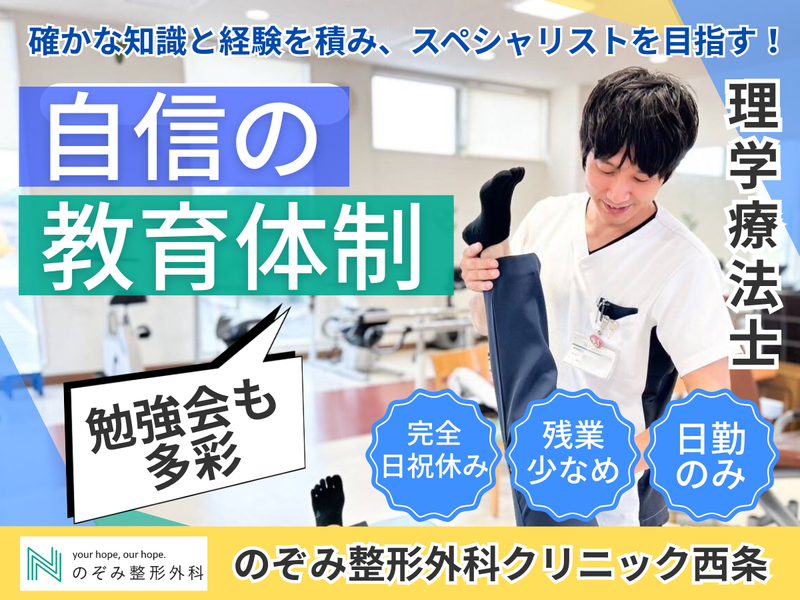 職種/仕事内容 | 仕事内容 \最大5万円!入職祝い金キャンペーン実施中♪/ ※規定・詳細はHPをご確認ください ┏━━━━━━━━━━━━━━━━━┓ 【のぞみ整形外科クリニックのおすすめポイント】 ✅社会保険加入 ✅週4日~OK ✅平日のみOK ✅副業可 ✅保育園併設 ✅時間、曜日相談可 ✅整形外科に特化◎ 【数字で見るのぞみ整形外科クリニック西条】 ◎来院患者数 550人/日 ◎在籍PT常勤: 27人 非常勤3名 ◎平均年齢: 31.9歳 こんな方におすすめ ◎家庭と仕事両立して働きたい方 ◎人間関係が良い環境で働きたい方 ◎理学療法士としてより経験を積みたい方 あなたのご経験を活かして、一緒に働きませんか。 ┗━━━━━━━━━━━━━━━━━┛ *\情報収集だけのお問い合わせもOKです/* 絶対損はさせません! 職場見学のみも絶賛受付中! ご興味ある方はぜひお気軽にご応募ください♪ ⏬⏬⏬⏬⏬⏬⏬⏬⏬⏬⏬⏬⏬⏬ 電話:082-264-1700(担当:カネヤマ宛) 受付時間:9:00〜18:00 ⏫⏫⏫⏫⏫⏫⏫⏫⏫⏫⏫⏫⏫⏫ ■仕事内容 患者さん一人ひとりに最適な施術を提供する、 リハビリテーション業務を行っていただきます。 【主な業務】 ・外来患者様への施術実施 ・機能訓練指導 ・運動補助 ・その他付随する業務 \*理学療法士の採用ピッチ資料公開中*/ https://www.nozomi-clinic.jp/recruit/archives/6815 詳しくは当院の公式サイトをご覧ください! ■*西条クリニックの良いポイント* 1. 院長の人柄が魅力的 院長は非常に温厚で親しみやすい性格です! スタッフや患者さんに対して思いやりをもって接してくれるので働き安い! 2. スタッフ目線を大切にしている 常に“現場目線”で物事を考えてくれるため、 患者さんとスタッフの意見を汲み取りバランスの良い判断をしてくれます! チーム第一に考えスタッフの立場や気持ちに寄り添った判断をしてくれます。 3. スタッフとの関係構築に積極的 スタッフ一人ひとりに関心を持ち、コミュニケーションを大切にしています! ■働く仲間も多く、常時協力体制をとれる環境 常勤27名 /非常勤3名 /平均31.9歳 新卒スタッフから経験豊かな先輩スタッフが幅広く活躍中! 急なお休みになっても自分以外にも患者さんを 理解しているメンバーがいるので心配ありません! ■企業主導型保育園完備で子育中には便利な職場 併設するのぞみの森保育園があります。 保育園利用料も福利厚生として月額14,000円に設定。 仕事も育児も頑張るあなたを、法人全体で応援します! 【のぞみの森保育園】 https://www.nozomi-clinic.jp/nozominomorinursery/ ■その他 髪の色、アクセサリー、ネイルなどは規定の範囲内で自由にしていただけます。 規定については面接時などにお気軽にご質問ください。 - \*職場・お仕事紹介の動画公開中*/ 当院の魅力が詰まっておりますので、 是非ご覧ください! https://youtu.be/g1gwXEIx8M4?si=0iu8tGCBRxMMfGfn *\採用Instagramも見てね/* のぞみ整形外科クリニック【採用】 https://www.instagram.com/nozomiseikei_clinic/ *\のぞみ整形外科採用 HP/* https://www.nozomi-clinic.jp/recruit/ ※より詳しい働き方や制度については、 ぜひ【採用】ホームページをご覧ください \*入職祝い金キャンペーン実施中♪*/ ※詳しくはのぞみ整形外科採用HPをご覧ください。 |
