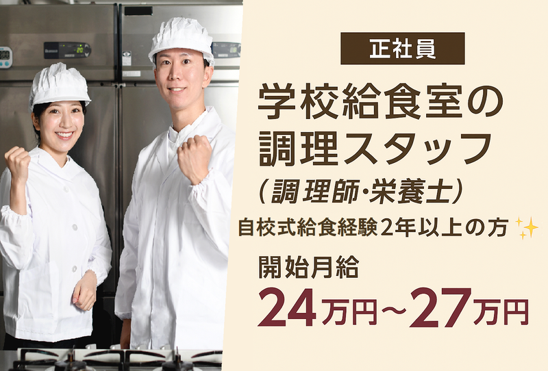 職種/仕事内容 | 仕事内容 【 月給27万スタート可/安定勤務 】 ✨自校式学校給食経験2年以上の方募集✨ ━━━━━━━━━━━━━━━━━━━ ✦✦【 経験を活かしてキャリアUP! 】✦✦ 副責任者・責任者候補として活躍ください ⭐経験年数などで開始月給27万も可⭐ ━━━━━━━━━━━━━━━━━━━ ⏩リーダーなど役職経験不問! ⏩面接1回のみ!筆記・実技なし ⏩応募は約1分でカンタン入力 ⏩電話応募も歓迎▶0661529061 阪市東成区(今里駅近く)の今里小学校の給食室です。 最初は献⽴に従って、他のスタッフと一緒に調理全般をお願いします。 ・単独校給食の調理業務 ・在庫管理、など ・徐々に副責任者または責任者業務もお任せします イチからお教えしますので、リーダーなどの役職経験は必要ありません。 ✨ 発注業務なし! ✨ 栄養士の方も献立作成ありません。 ✨ 面接日・入社日の相談OK 「来月から」「月途中から」なども歓迎! ⚡男女活躍中!家庭優先大歓迎 ──────────――――――――― 創業60年以上の当社だから、 長く働ける職場環境に自信があります! ⏩ 賞与年2回!交通費全額支給! ⏩ 完全、土日祝休み!年間123日! ⏩ 本部に申請なしで有給取得可! ⏩ 16時半終業、残業なし ⏩ 春夏冬休みは全部休みもOK! ⏩ 制服・備品すべて会社支給 ⏩ 洗濯不要で家事負担なし ⏩ 65歳まで雇用延長可。退職金もあり! ⏩ おいしい給食が無料! ⏩ 小さいお子様がいる方も安心 ➡➡➡衛生上の体調不良で自宅待機をお願いした場合も条件により給与の6割を保証しています。 ⚡イートランド株式会社について ──────────――――――――― 当社は「⾷」に携わる事業を多岐に展開する会社︕ 栃⽊県宇都宮市で創業60年以上 総スタッフ数は3000⼈ 全国の学校給⾷室、社員食堂、病院給⾷室や飲⾷店などの運営しています。 当社の関西事業所がサポートします。 ✨他にも勤務地たくさんあります✨ 業務拡大につき大阪市内で正社員を大募集 近隣エリアに多数、勤務可能な学校給食室がありますので、「うちの近くにありますか?」などお問合わせのお電話も大歓迎 ※パート調理補助スタッフも同時募集中! |