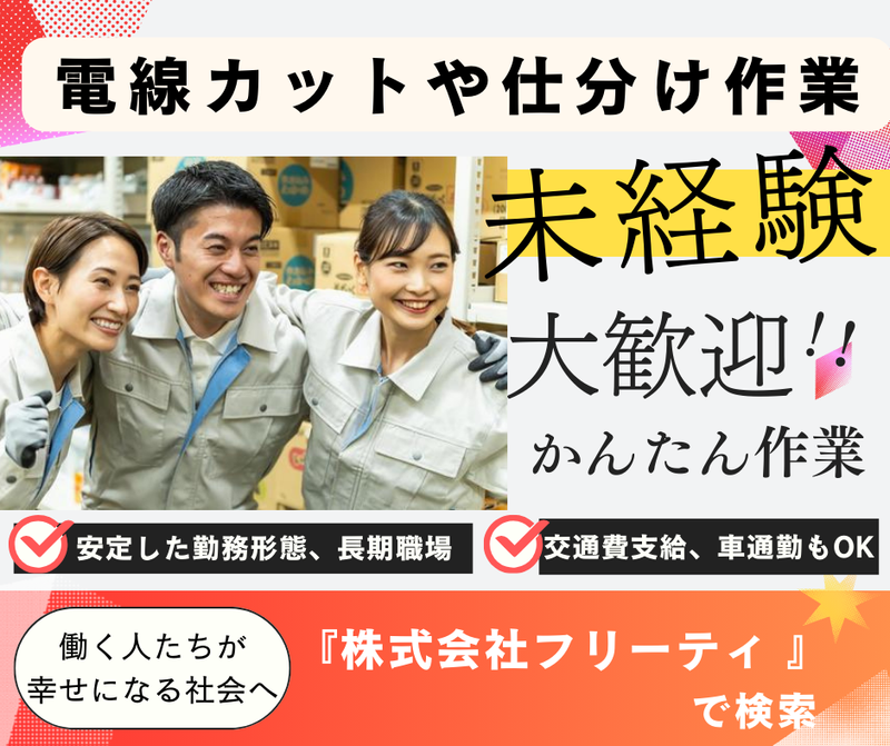 職種/仕事内容 | 仕事内容 【未経験大歓迎✨もくもくカンタン作業✨】 工場内で、カットや仕分けなどカンタン作業をお任せします! ✅電線を自動測定機で決められた長さになったら、ストップボタンを押してカット! ✅カットしたものを所定の場所に振り分けるだけ♪ 誰でもできるシンプルな作業です! まずはできる範囲で、ゆっくりスタートしましょう✨ ★元気さえあれば60代の方も歓迎です! |