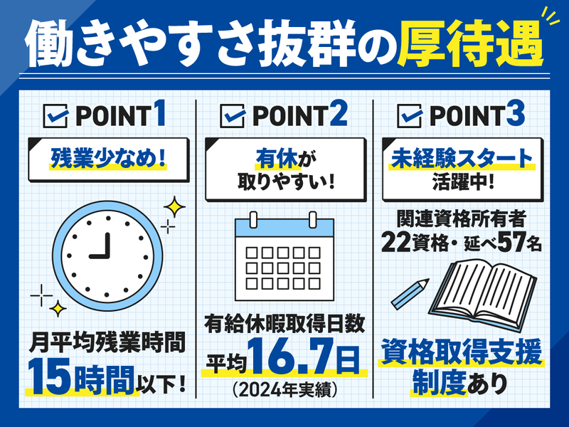 休日休暇 | 休日休暇 【4~11月】 週休2日制(土曜・日曜)、祝日 【12~3月】 隔週休2日制(日曜・隔土曜)、祝日 ※会社カレンダーによる ※年間休日115日 【休暇制度】 ・夏季休暇(3日間) ・年末年始休暇 ・慶弔休暇 ・産休、育休 ・有給休暇 ->平均取得日数16.7日! ワークライフバランスも重視可能! (2024年度実績) |