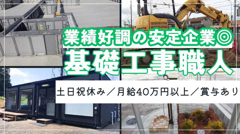 職種/仕事内容 | 仕事内容 〈 月給40万円~月給60万円 〉 〈 完全土日祝休み・日勤のみ 〉 創立して8年目とまだ新しく意見し易い! / 業績好調の安定企業◎ あなたの経験を最大限評価します! \ ◤ 土日祝休み/9~17:00 現場作業では珍しい土日祝休み ◢ ・・・・・・・・・・・・・・・・・・・・・・・・・・・・・・・・・・・・ 残業も必要最低限の働きやすい環境を 整えています! 仕事終わりの自分のプライベート時間 家族との時間も予定を立てやすい♪ ワークライフバランスを取りながら 今後も安定して続けられるように あなたの意見もどんどん取り入れます! ◤ 経験や資格が即戦力に! 先輩との関係性も良好のチーム作業◢ ・・・・・・・・・・・・・・・・・・・・・・・・・・・・・・・・・・・・ 集合住宅などアパートや マンションの基礎工事業務全般をお任せ! 現場スタッフは現在11名が活躍中◎ ●具体的には… ✓毎朝、松戸市紙敷(事務所・置き場) に集合し、現場へ向かいます。 ※現場は千葉県東葛地域がメイン。 その他千葉市~房総方面や茨城県 ✓2~3人の1組でチームを組んで 業務を行います! ▮基本給ベースアップ!  ̄ ̄ ̄ ̄ ̄ ̄ ̄ ̄ ̄ ̄ ̄ ̄ 月給40万円以上のスタート! 最大月給は60万円からのスタートです◎ 経験やスキル、頑張りが給与に直結する 風通しの良い評価体制も自慢! ▮やりがいも充分!  ̄ ̄ ̄ ̄ ̄ ̄ ̄ ̄ ̄ ̄ ̄ ̄ 私たちの仕事は、建物の土台を作る 基礎工事から外構(エクステリア)工事 まで様々です。 作業中は2、3人のチームで お互いにサポートするので、 体への負担も軽減◎ 仕事を通じてあなただけの スキルを身に付け高められます。 1人で現場を回せるようになれば、 "月給60万円"も可能です。 スタッフにはストレスなく 働いてほしいから、 【給与日払い】の相談も 受付けていますよ。 創立して8年目とまだ新しく、 ルールなどが定まっていません。 あなたの経験で ここはこうした方が良いのでは? という部分があれば どんどん意見を出して頂いて大丈夫! 意見を出し合い、 より強い会社づくりに参加して下さい! |