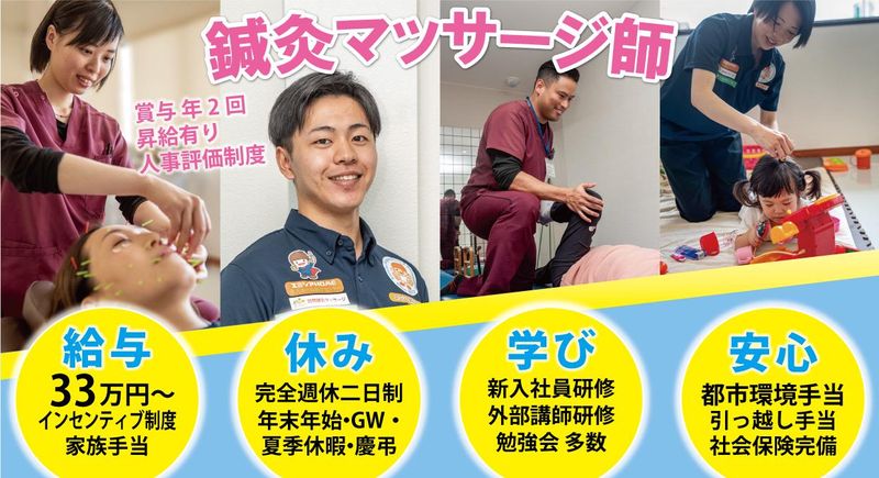 待遇・福利厚生 | 【保険制度】 雇用保険、労災保険、健康保険、厚生年金 【福利厚生】 待遇・福利厚生 【福利厚生】 ■都市環境手当 30,000円 ■家族手当 ※社内規定による (配偶者10,000円、子5,000円/人) ■保育園費・学童保育費手当 (上限25,000円) ■通勤手当 (月額上限10,000円) ■引越し手当 (50,000円) ■制服(ユニフォーム)支給 (2~3着) ■社用車貸与(1人1台) ・通勤利用OK ・休日使用OK(遠方の方で車未所持の方) ■研修・勉強会あり ・新人研修制度 (接遇教育、同行研修) ・外部講師による実技研修・セミナー (研修費会社負担) ・小児障がい児の研修 (社外研修・社内研修どちらも実施) ・研修用の施術動画あり ■月2回面談実施 |