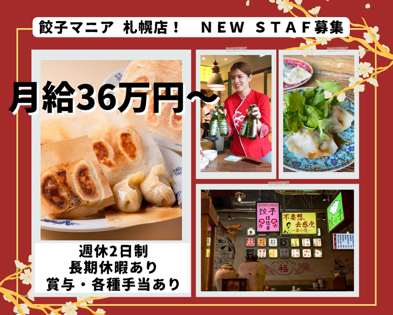 職種/仕事内容 | 仕事内容 ~*~*~*~*~*~*~*~*~*~ ミシュラン・ビブグルマン掲載の味を武器に マニアブランドを全国へ! \働きやすさ・やりがい・待遇◎/ ▽求人のポイント▽ *明確な評価軸 *経営ノウハウが学べる *独立しやすい環境 *店舗運営の自由度が高い *休暇と給与は高水準 ~*~*~*~*~*~*~*~*~*~ <仕事内容> まずは店舗や会社を知ってもらうため、 現場で企業・店舗理解を深めてもらいます。 ・接客などのホール業務 ・スタッフ育成 ・仕入れや原価管理 ・その他マネジメント業務 経験やスキル、希望に合わせて お仕事をお任せしていきます。 分からないことや不安なことがあれば、 なんでも相談してくださいね◎ ゆくゆくは店舗マネジメントや、 複数店舗の統括もお願いしたいです! FC展開や新店舗も予定しているので 出来ることからお願いしていく予定です。 多くの経験を積める環境なので、 将来の独立を目指す方にもぴったりです。 ▼当社のアピールポイント▼ \従業員の働き方改革に挑戦中/ 「飲食業界は給与が低い」 「飲食業界はブラック」 「家族に反対される」 たしかに日本の飲食店は個人店も多く、 制度設計が出来ていないことで そんなイメージも多いのは事実。 そんな業界イメージを払拭し、 利益率の高いマニアブランドでの 新たな働き方を手にしてください。 <当社の5つの取り組み> ◆充実した手当と待遇面 住宅手当や家族手当など 代表が上場企業出身のため、 通常の飲食店ではまだ整備されてない手当が 当社には多数あり! 家族にも認められる、尊敬される。 そんな働き方をしてほしいと 本気で思っております! ◆利益率が高く、高水準の給与体系 飲食店は利益率が低いとされていますが、 弊社の利益率は平均で20%~30以上! 中には40%を達成する店舗もあり、 全店舗が黒字化運営をしております! 原価が安い餃子を中心に本格高級料理へと 変貌していく当社のビジネスモデル。 どのお店も繁盛店になるからこそ、 従業員の高水準の給与を実現できています! ◆圧巻の研修制度とその種類! 入社後研修をはじめ、マナー研修、 ビジネス研修など当社の研修は種類が豊富。 本場中国の味を再現するため、 現地の学校から受ける教育制度、 外部の有名講師を招いたサービス研修など、 スキル・経験は入社後でも身につきます! ◆社内がフラットで入れる環境! 制約がないからこそ自由に発言が出来る! そんなフラットな職場環境を実現! 社員旅行はもちろん、ベンチマークしている 繁盛店視察、社員総会、PA卒業式など、 社内コミュニケーションを 重要視しているため、 日々の業務以外で交流を深める環境を 準備しております。 新メニューなども気軽に社長に 相談して開発でき、 予算を気にせず、基本NGなし! 前向きな目標を持っている 従業員が多いので 刺激的な職場であることは 間違いありません。 ◆長く働ける職場!低い離職率! 創業から7年、最初から一緒に会社を 作ってきた従業員も多く、勤続年数は長め! 独立志向、役員を目指したい、 そんな方たちのために、 今後は店舗で働く以外の部署も 作っていきます! 代表も上場企業でアルバイトから 役員になっているので、 固定概念なんてありません! 知識や経験を存分に発揮できる 将来のキャリアも準備するので 安心して働いてください! <餃子マニアってどんなお店?> 店内には中国の屋台をイメージした 装飾が施され、赤い提灯や ネオン看板が並ぶ賑やかな空間です。 「異国情緒を感じられる!」と お客様からも大好評! 旅行気分で美味しい餃子を楽しめます♪ <どんなお料理を提供しているの?> メイン料理は大人気の餃子! ここでしか食べれない餃子もあるので リピートのお客様も多く来店! ガチ中華としておつまみなど 本場の味を完全再現しています。 店内だけでなく、お皿やお酒まで こだわりを持って提供しております。 ◎当社で働くポイントはこちら◎ (1)将来独立したい若手必見! 当社のプロデュースは従業員にまで 及びます! 創業メンバー2名も自身の夢を叶えて プロデュースを経て独立! 物件探しから店舗のデザイン、 店舗の出店資金や借り入れまで お手伝いします! 30坪ディナーのみの営業で店舗利益 500万円が残るほど、集客に自信あり◎ (2)業界トップクラスの高月給! 高いパフォーマンスを出すためには、 社員さんの満足度が一番と考え、 業界TOPレベルの待遇をご用意しています。 ◇スタッフの平均月給35万円! ◇経験者の方は初任給でも 39万円以上のスタート可能! ◇複数店のマネージャーは 年収600万以上も実現できます! (3)飲食で働く以外の仕事も学べる! 飲食は来店してくれるお客様が一番。 当社はプロデュース店舗を 100店舗作っていくため、 プロデュース依頼の経営者様もお客様です。 依頼のあった経営者様に対して お店の立ち上げ教育など BtoBの仕事も出来る! 経営ノウハウは格段とあがること 間違いナシ! (4)食べログ100名店選出! グルメサイトに頼らずして 月間1600万円超の売上を作るお店が多数! 餃子100名店、ビブグルマンを 